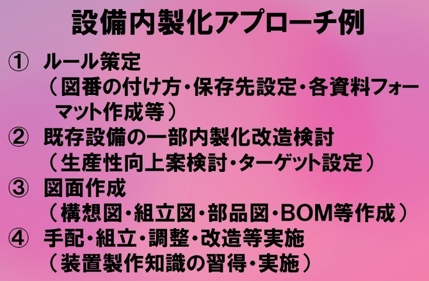 また、生産技術という専門分野は、生産部門だけではなく、品質管理、人事、総務などに応用可能なスキルやツールもあります。これらをふんだんに活用することで、QCD(品質・コスト・納期)の改善、生産性向上など、企業の経営戦略にも直接貢献できるプログラムを提供します。