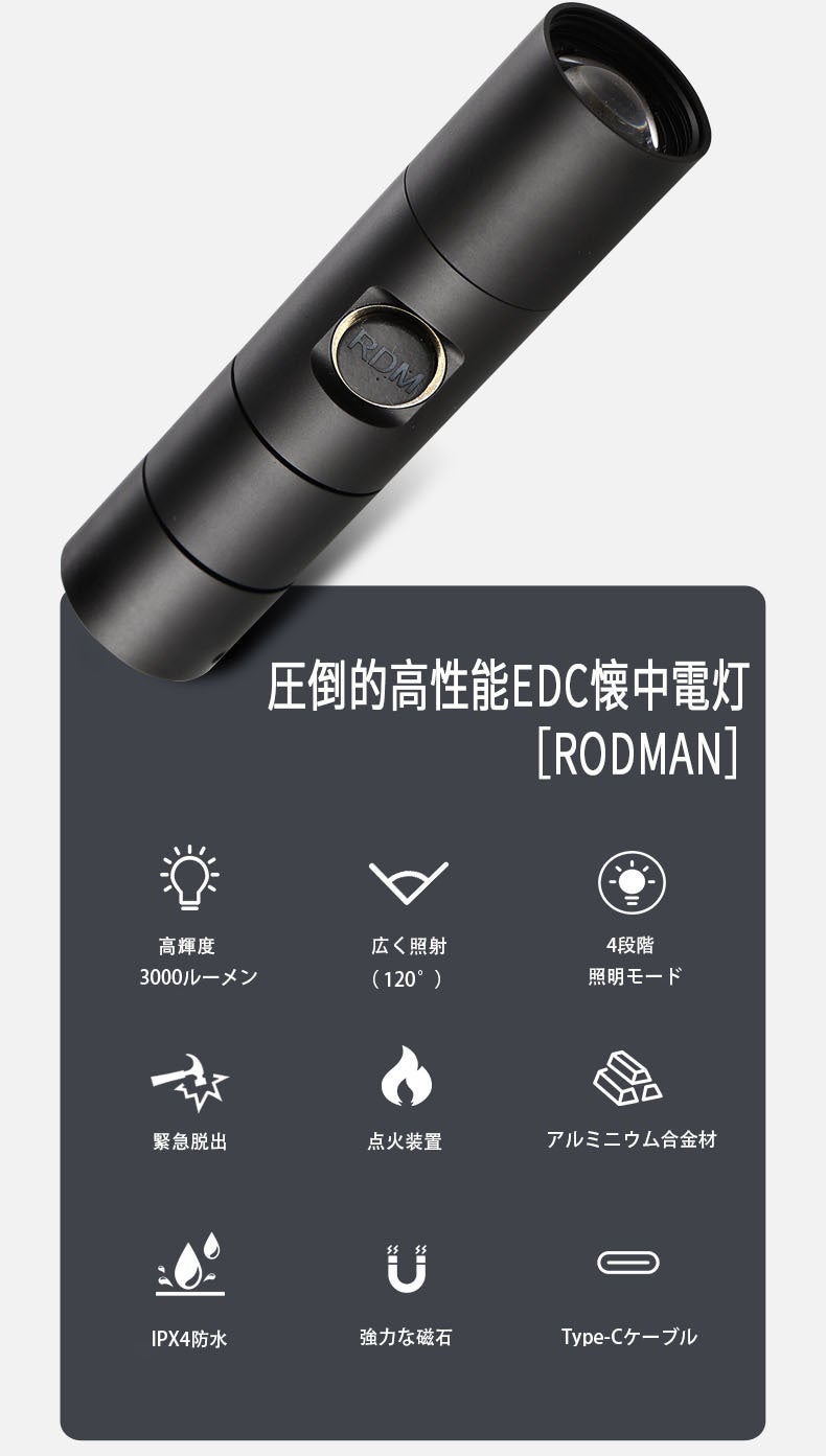 [RODMAN]は懐中電灯としてだけでなく、点火装置、安全ハンマー、補光ライトとしても使用でき、モジュールを交換するだけでユーザーのさまざまなニーズに対応できます。