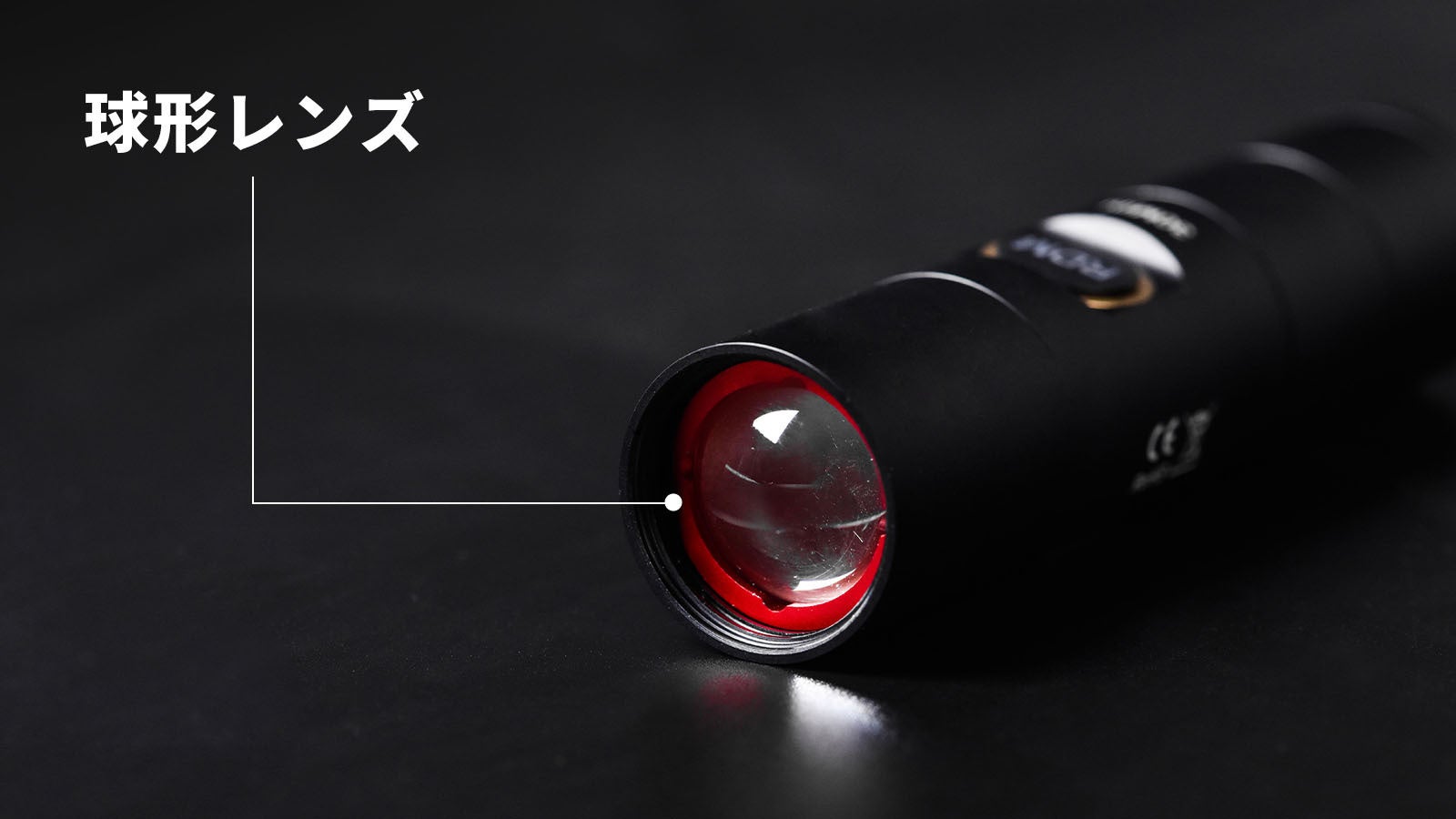 広く照射角度が変わる秘訣はこの特殊な球面レンズであり。