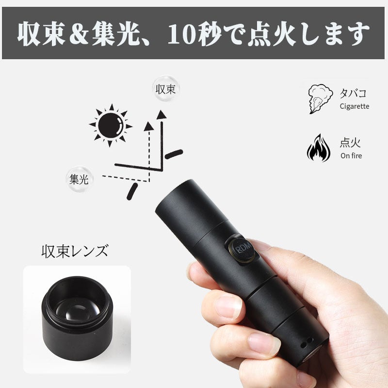収束レンズを取り付け、焦点を最大に調整し、そして電源ボタンを長押しすると、濃い可燃物を点火することができます。