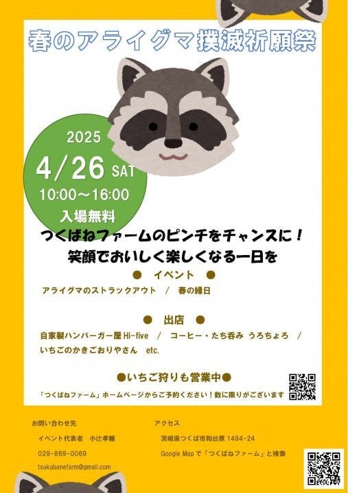 活動報告担当の藤原です( ̄∀ ̄)きたる明後日、4月26日に春のアライグマ撲滅祈願祭としてつくばねファームでイベントを開催します(≧▽≦)クラウドファンディングのお礼ももちろん申し上げたいので、支援いただいた方もそうでなくともぜひお越しくださいね!つくばねファームトップページよりいちご狩りのご予約もできますよ!https://tsukubanefarm.com/gari/笑顔でおいしく楽しくなる一日を!それではまた明日お会いしましょう~(▽◕ ᴥ ◕▽)