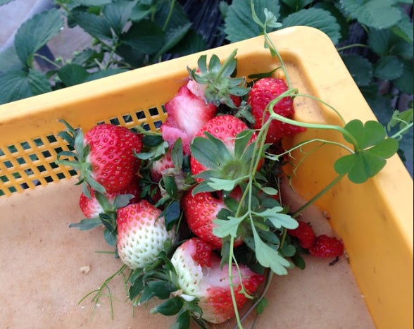 初物いちごの収穫。