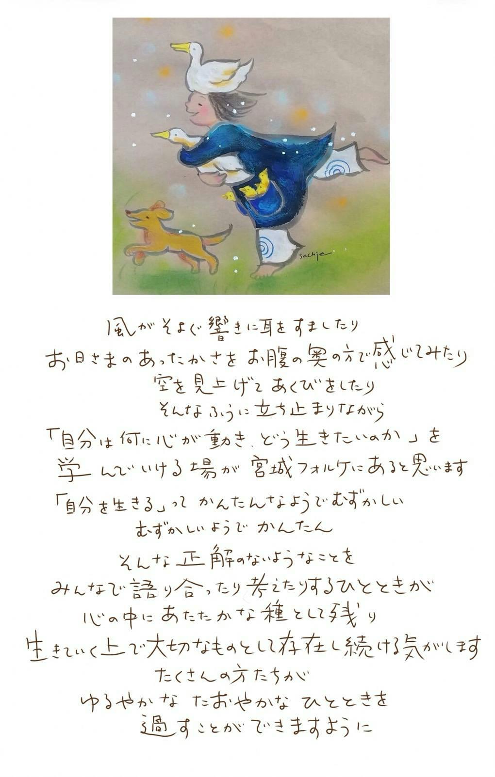 東北、宮城に、フォルケホイスコーレが出来る! 今からとても楽しみです! どの年代の人にとっても 生き方を考える場や時期は必要だとずっと思っていました。 私がやっている1to1コーチングもその一つかもしれませんが、 想いを同じくする他者と関わりながら、生活を共にしながら、そこから見えてくる“これからの私”はより大きくて豊かなもののはず。 そんな場になるのが「フォルケホイスコーレ」でしょう。 地域との関わりや食、温泉を含めた宮城フォルケでの暮らしを通して、 「足りないもの」に向いていた意識は 「自分が既に手にしているもの」に気づき、 「自分の可能性」を信じられる感覚に移行していく…と確信します。 フォルケホイスコーレ 「生き方と向き合う文化」が広がり、根付くことを心から応援しています!
