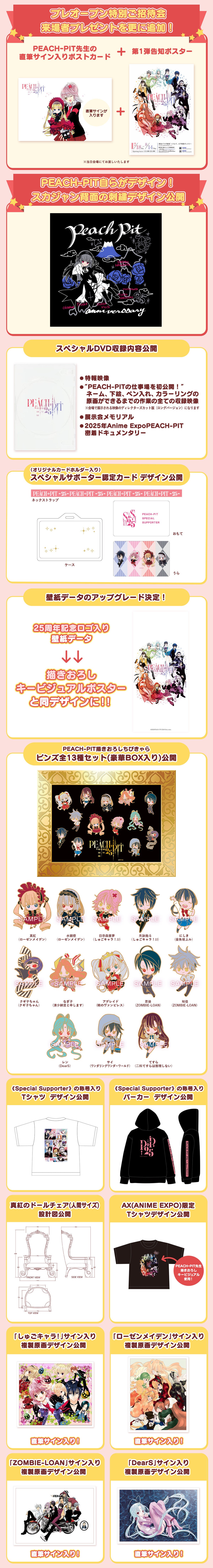 2025/10/31 16:46P.P.2525 Xmas感謝祭開催!!ありがとうを伝えたい!PEACH-PIT25周年特別展を応援してくださった皆様、 ハラカド展にご参加くださった皆様にありがとう&来年もよろしくねの気持ちを込めて 「P.P.2525 Xmas感謝祭」を渋谷SACSで開催します!会場では2026年のビッグニュース発表も予定していますので皆さん是非ご来場ください。開催期間:12月17日(水)~12月19日(金)開館時間:11:30AM~9:00PM会場:渋谷SACS 東京都渋谷区桜丘町16-12 桜丘フロントビル 1F(渋谷サクラステージ前 赤○、青→の場所)入場無料展示 Selected ART (from the Harakado exhibition)クリスマスアレンジver. 2025メモリアルDVD上映毎日イベント開催!!ビンゴ大会 毎日4回(午後2時、4時、6時、8時30分)開催 毎回上位5名様にPEACH-PIT先生ご提供私物他、賞品をプレゼント!PEACH-PIT先生サイン会 毎日午後7時30分から 17日:千道万里先生 18日:えばら渋子先生 19日:千道万里先生、えばら渋子先生 ※25周年展グッズ1点に直筆サインを入れてお渡しします ※19日のサイン入れはどちらかおひとりのサインになります(選択不可)イベント参加条件 会場内グッズ3,000円(税抜)購入毎に・ビンゴカード1枚配布 ・サイン会参加抽選券(当選数:毎日100名様) ※PEACH-PIT25周年特別展盛り上げプロジェクト支援者様、ファンクラブ「PEACH TREE」会員の方にはクリスマスプレゼントをご用意しております。当日御礼メッセージ画面、会員証をご提示ください。 もっと見るリターン品間もなく発送開始いたします!