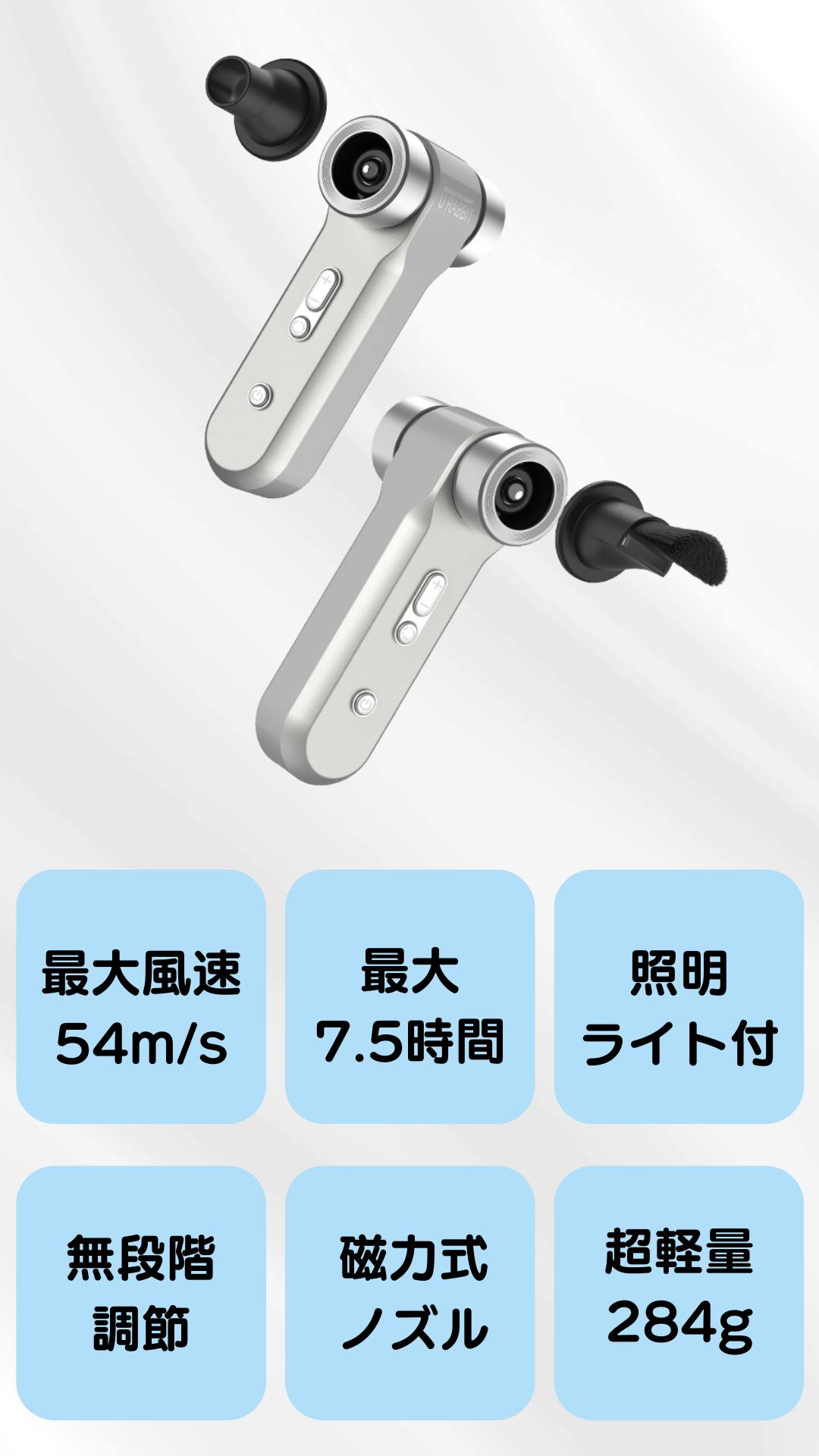 『U RABBIT』は、風速無段階調整機能 を搭載し、用途に合わせた最適な風力を自由に設定可能。弱風で精密機器のホコリを優しく除去したり、最大風速で洗車後の水滴や落ち葉を瞬時に吹き飛ばすことも可能です。指先で簡単に調整できるため、細かい作業からパワフルな清掃まで幅広く対応。