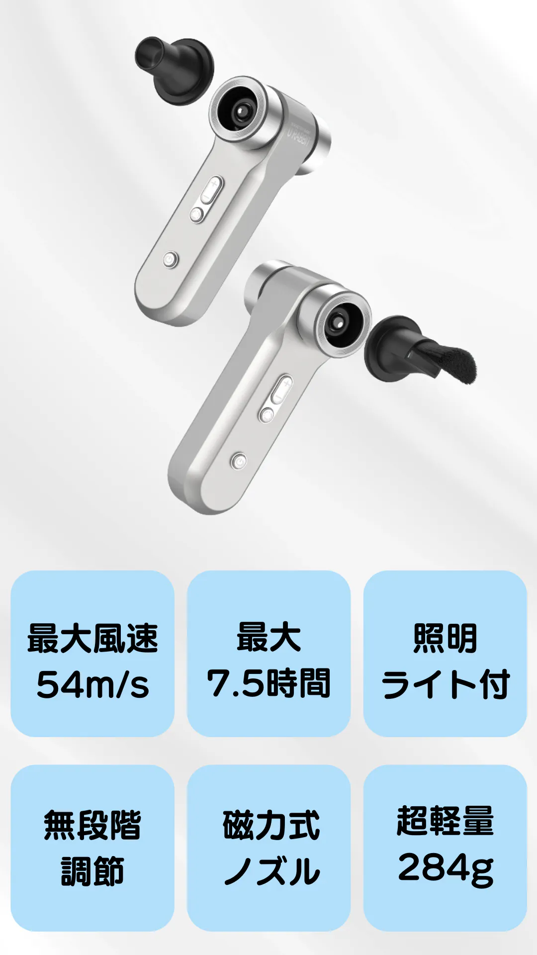 『U RABBIT』は、わずか284gの超軽量&コンパクト設計 で、長時間の使用でも手が疲れにくく、持ち運びもラクラク。片手で簡単に操作でき、狭い場所や高い位置の清掃もスムーズに行えます。スマートフォンとほぼ同じ重さながら、強力な風力と多機能を搭載 し、洗車・掃除・アウトドアなどあらゆるシーンで活躍。