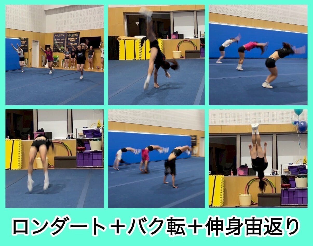 チアリーディングのタンブリングとは、ダイナミックでスピードやパワーのある回転技や、シンクロ性のある美しい技で、2分半の演技をより華やかにする要素の一つです。私たちstarcats GOLDが出場するopen編成level4ではその場でのバク転+宙返りなどの連続した回転技や走り込みの回転技を組み合わせチームメンバーと合わせて行います。