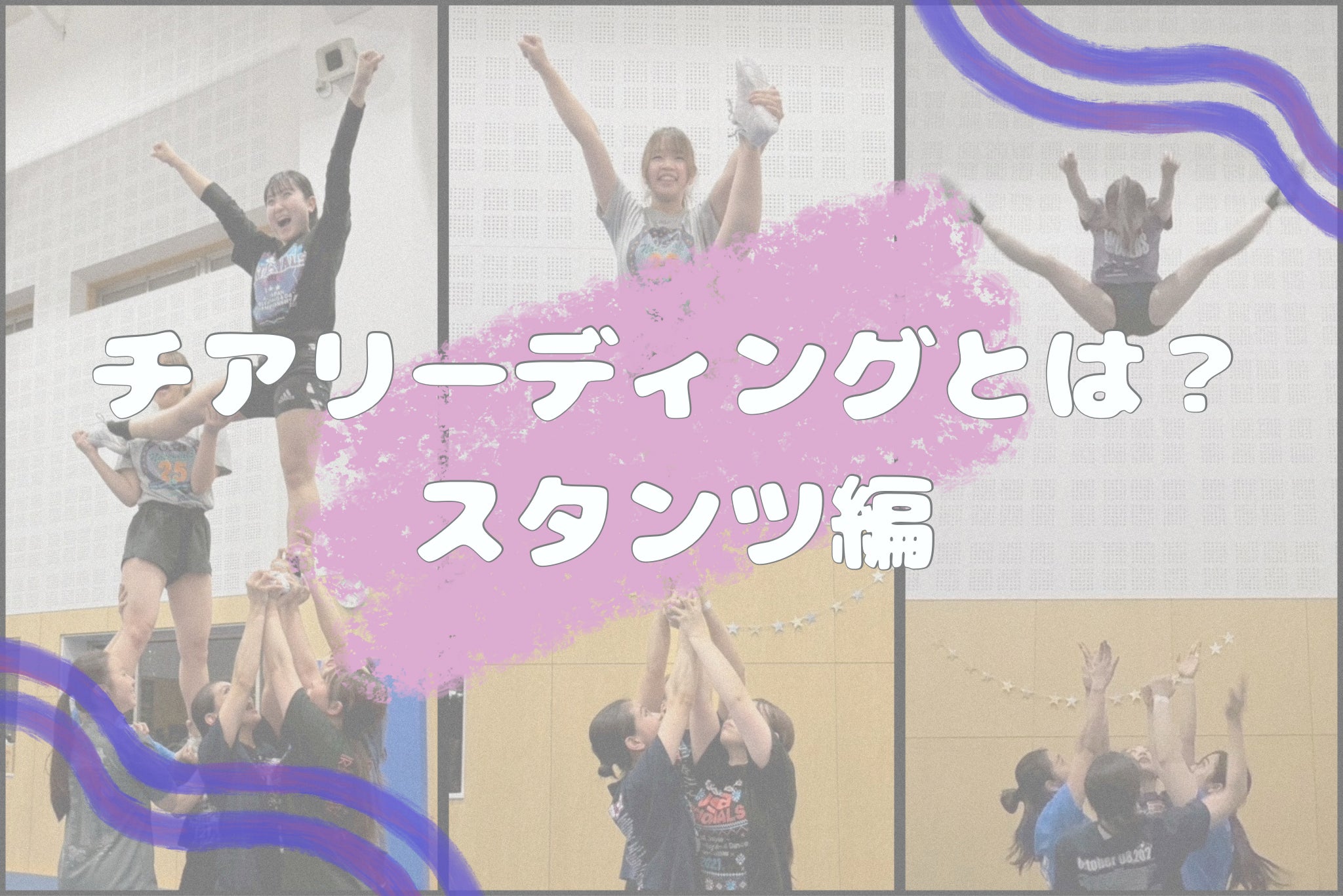 今回は4つの要素のうちの1つ、チアリーディングの華であるスタンツと呼ばれる技について解説します!スタンツとは主に上に乗るトップ、後ろから支えるスポット、下から支えるベース2人の計4人で作る組体操技術の技です。4人でひとつの技を作るので、誰か一人でもタイミング、力加減、方向、気持ちがずれてしまうと失敗してしまいます。つまり、スタンツの成功にはチームの絆が欠かせません!また、テレビなどでスタントマンという言葉を聞くことがあるかと思いますが、実はチアリーディングのスタンツも同じ単語から由来しています。英語ではStuntsと書き、日本語では離れ業などの意味を持ちます。 スタンツの基本の形がこのエレベーターと呼ばれる技です。ベースは肩の位置でトップの足を支えます。他の技はすべてこの技の応用で、ベースがいちばん高い位置で支えたり、トップが片足立ちで立ったりします。 この他にもピラミッドやバスケットトスという技があるので紹介します。ピラミッドはスタンツを繋げ、トップ同士が手を繋いだり支えたりする大技になります。大会でも最も失敗してしまうリスクの高い技で、1人のミスでピラミッド全体が崩れてしまうこともあるのでみんなで息を合わせることがとても大切です。バスケットトスとはトップを高く飛ばし、トップが空中で開脚したり、回ったりする技になります。バスケットトスの見どころはなんといっても高さです。高さのあるバスケットトスは大会会場でも大きな歓声があがります!いかがでしたでしょうか!残り3つの要素についても解説していきたいと思いますので、次回も見ていただけたら幸いです。お楽しみに!