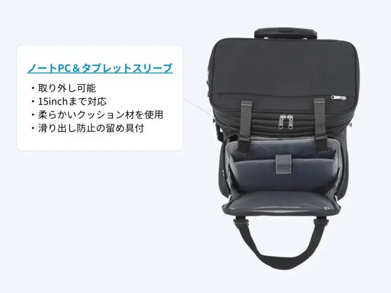 最大15インチのノートPCやタブレットを収納できる、クッション性のあるポケットを搭載。