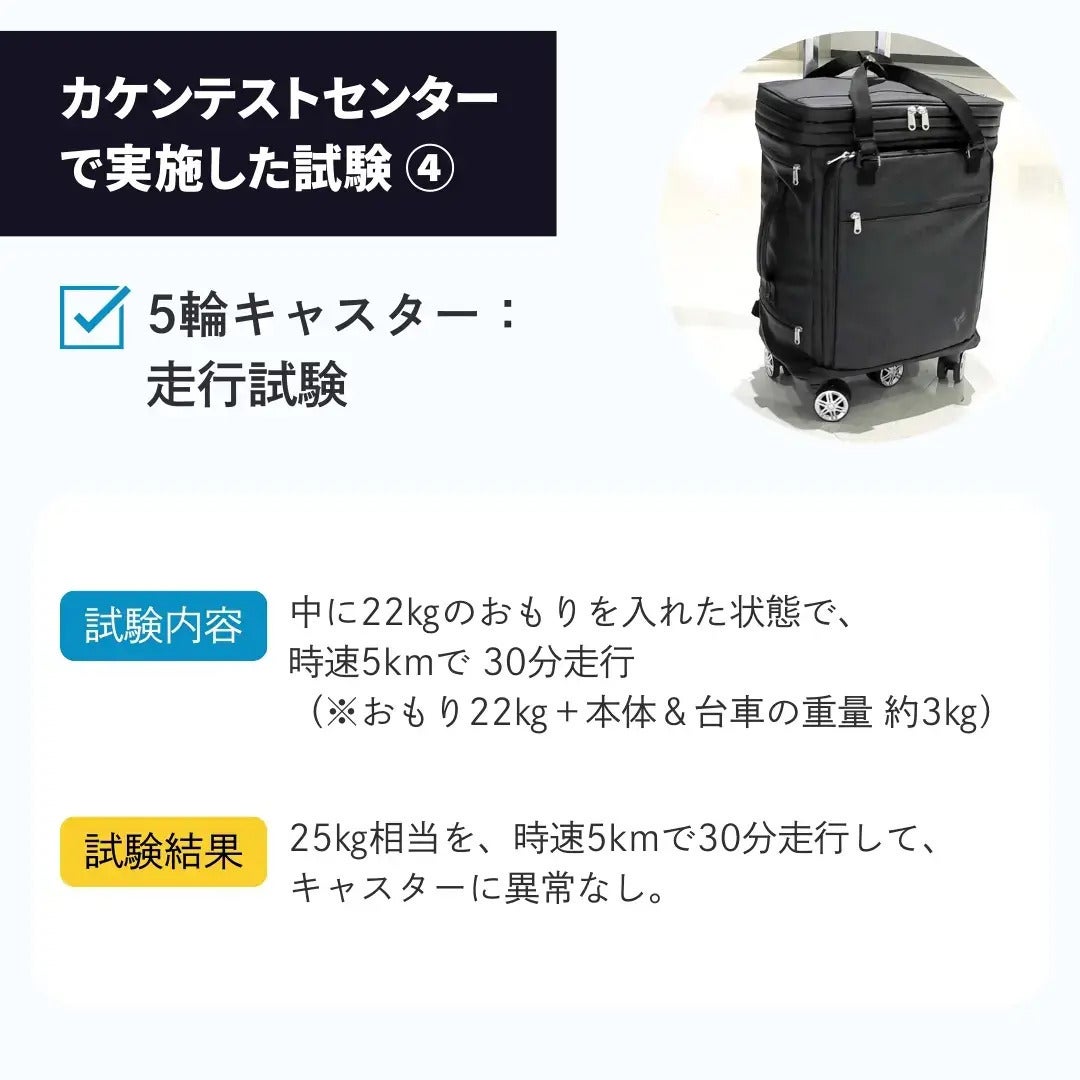 A:TRIPLUSの耐荷重は約25kg(荷物22kg+本体重量3kg)です。日常の旅行や出張で安心してご使用いただけます。