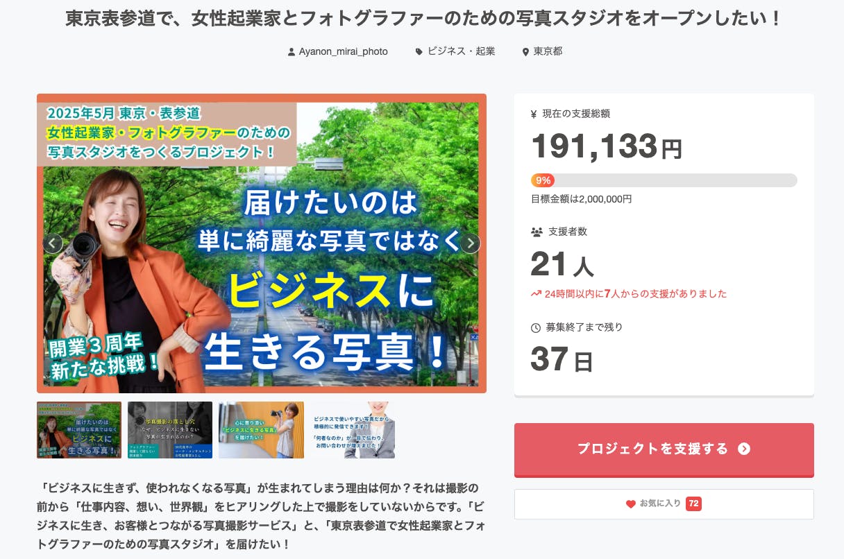 このたび5月13日、東京・表参道に女性起業家とフォトグラファーのための写真スタジオをオープンするため、クラウドファンディングに挑戦しています。現在、21名のあなたから、191,333円のご支援をいただいています。