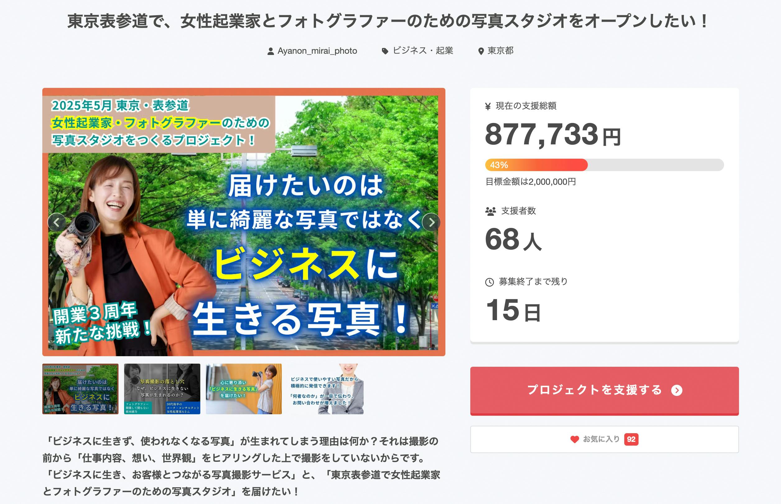 東京表参道で、女性起業家とフォトグラファーのための写真スタジオをオープンしたい!