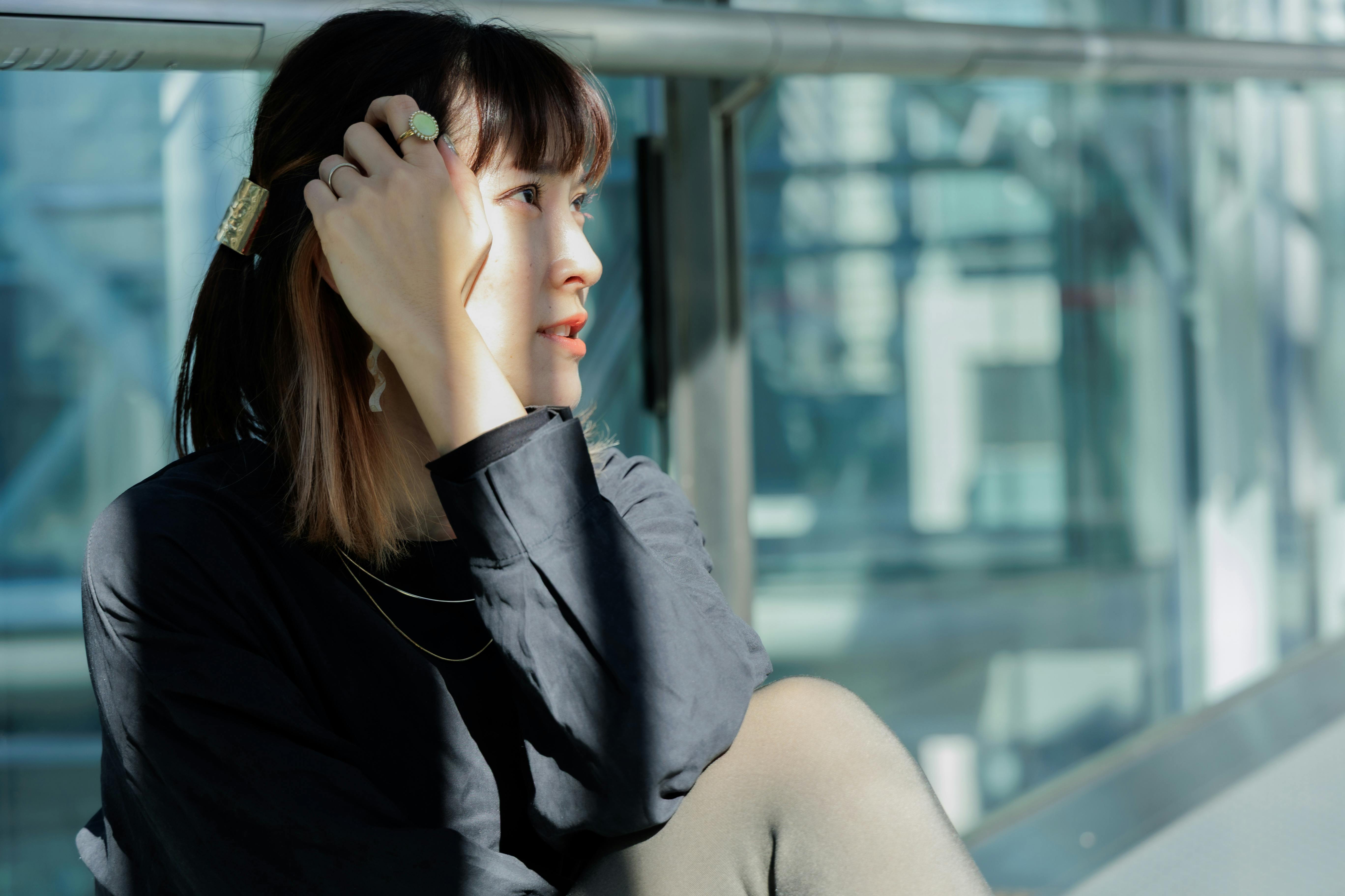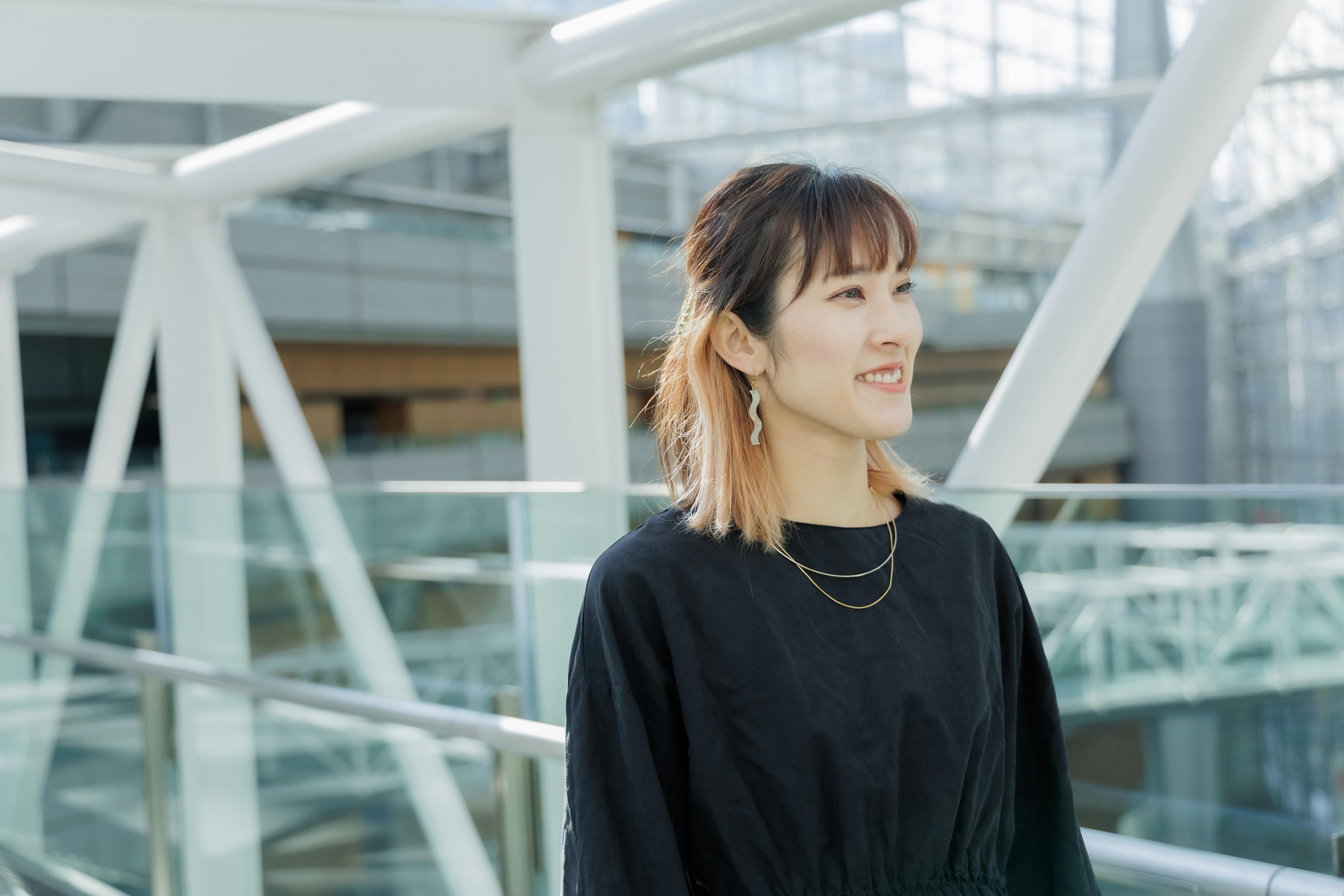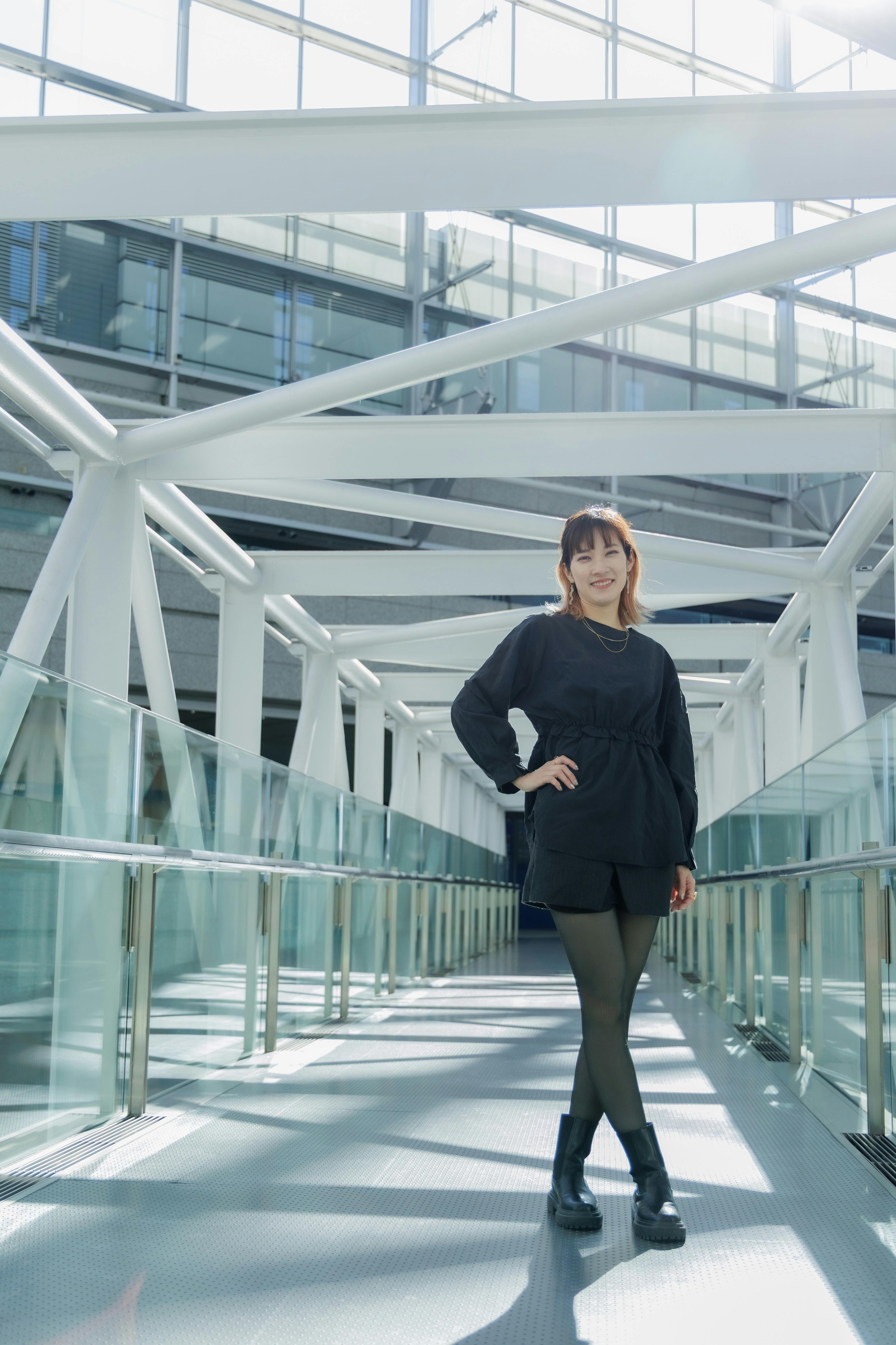 クールでスタイリッシュな、黒が特徴のブランドとのことで、都会的な背景でシャープな表情を撮影しました。