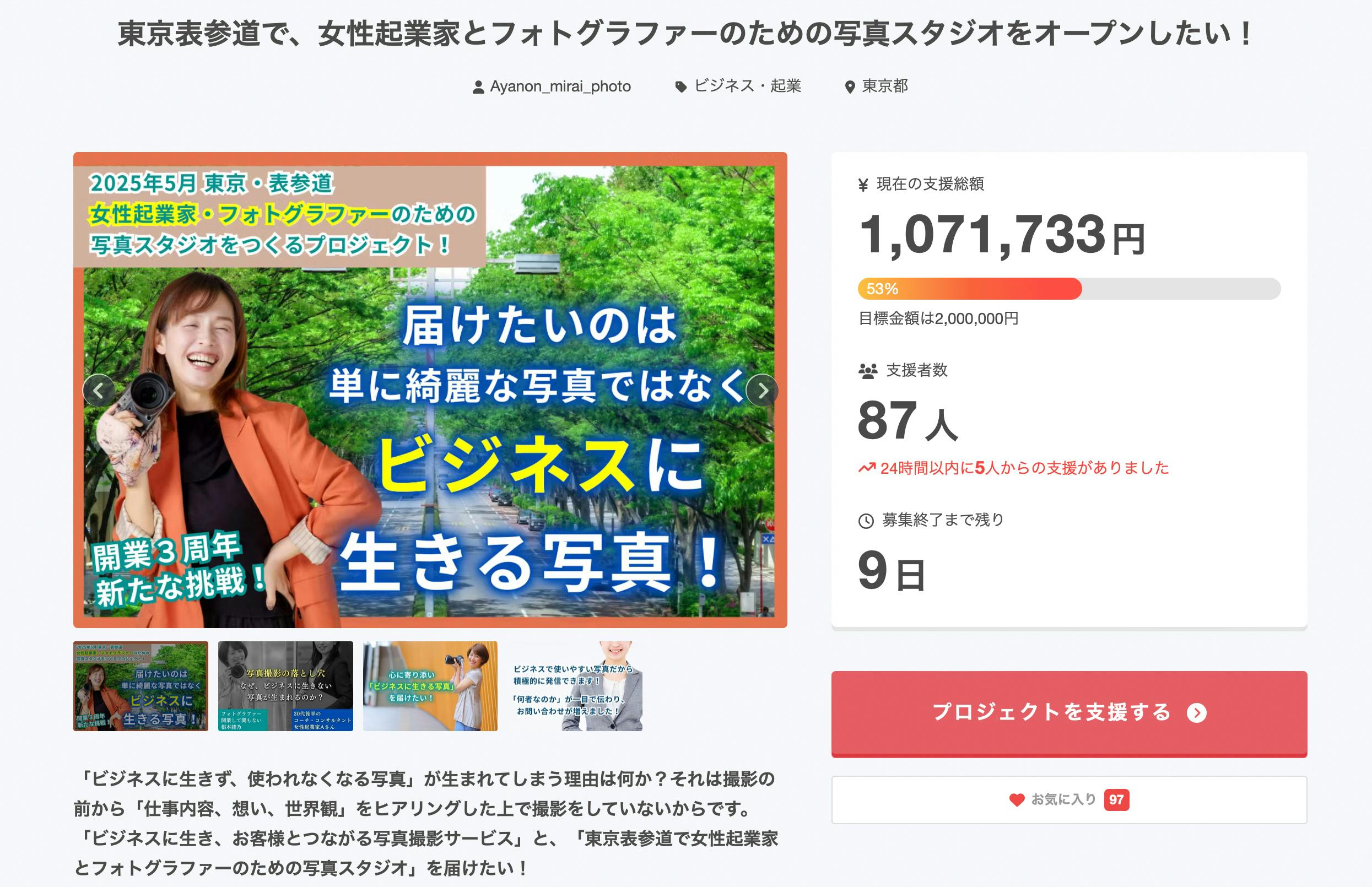 東京表参道で、女性起業家とフォトグラファーのための写真スタジオをオープンしたい!