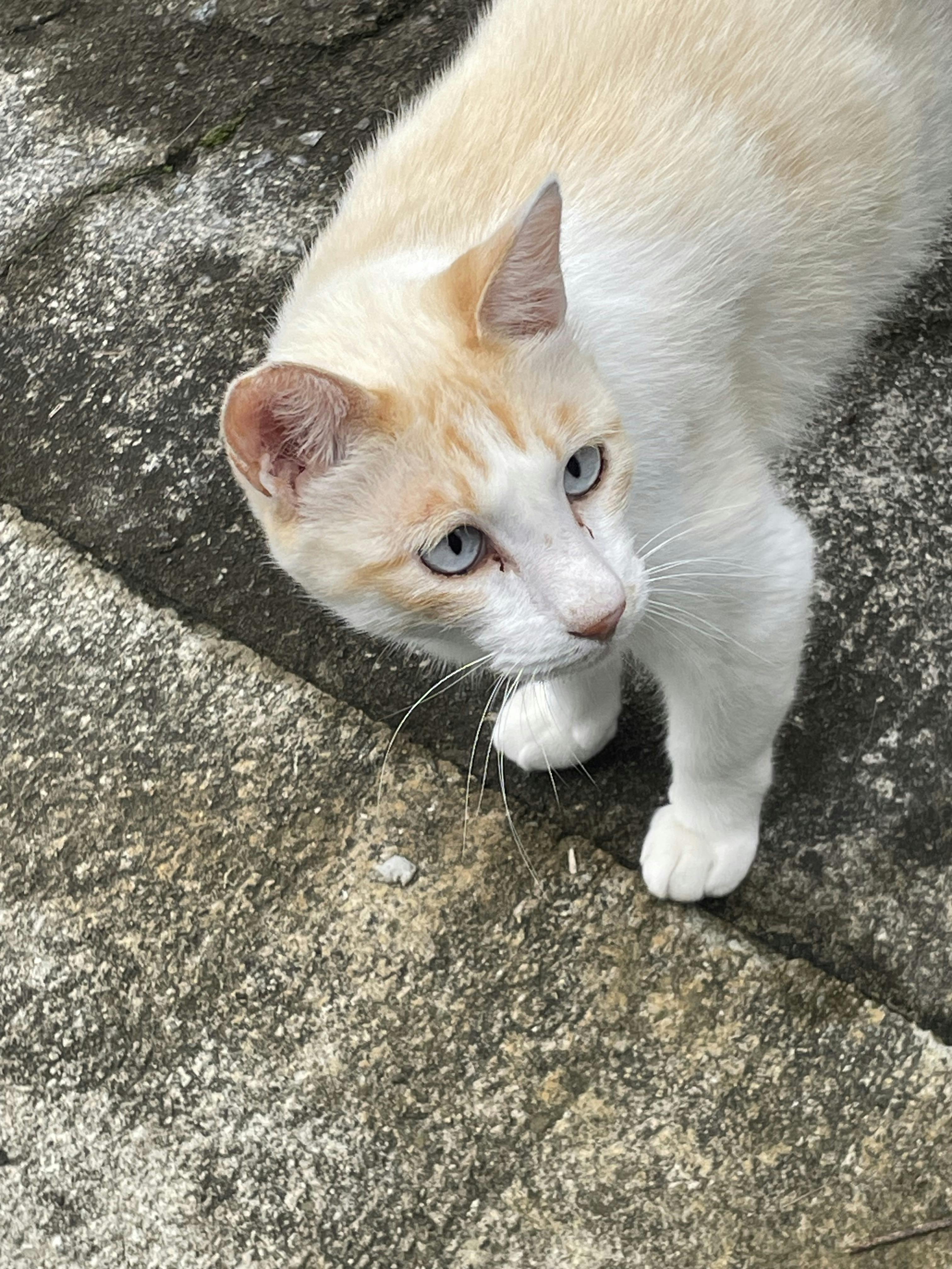 ご近所さんの家の石垣にちょこんと座っていました!未だ太陽が登る前だったので、暗い状態だったのですが、クリは割と白猫ちゃんみたいに白い毛が目立つので、なんとなく白いものが居るって思って(クリ??)って呼び掛けたら何時もの声で(ニャ、ニャ、ニャ)って擦り寄って来てくれました⸜(*ˊᗜˋ*)⸝ご飯を食べさせたらよっぽどお腹が空いていたのか夢中で食べていました(*^^*)写真撮る準備が出来ておらず写真を取れなかったのですが、クリちゃん無事見つかり昨夜も同じご近所さんの家の石垣の所に居て、私の足元に擦り寄って来たのでとても安心しました。