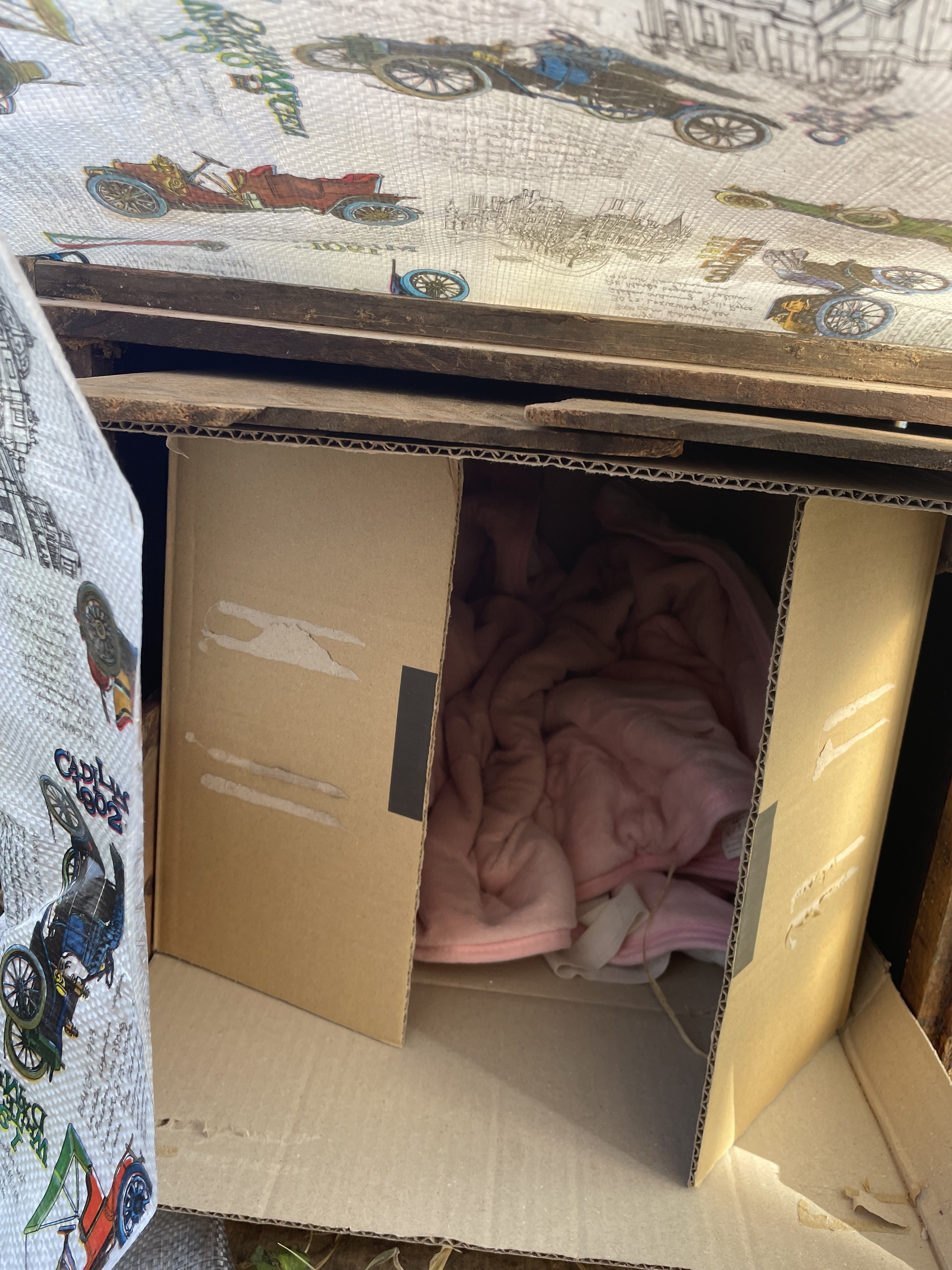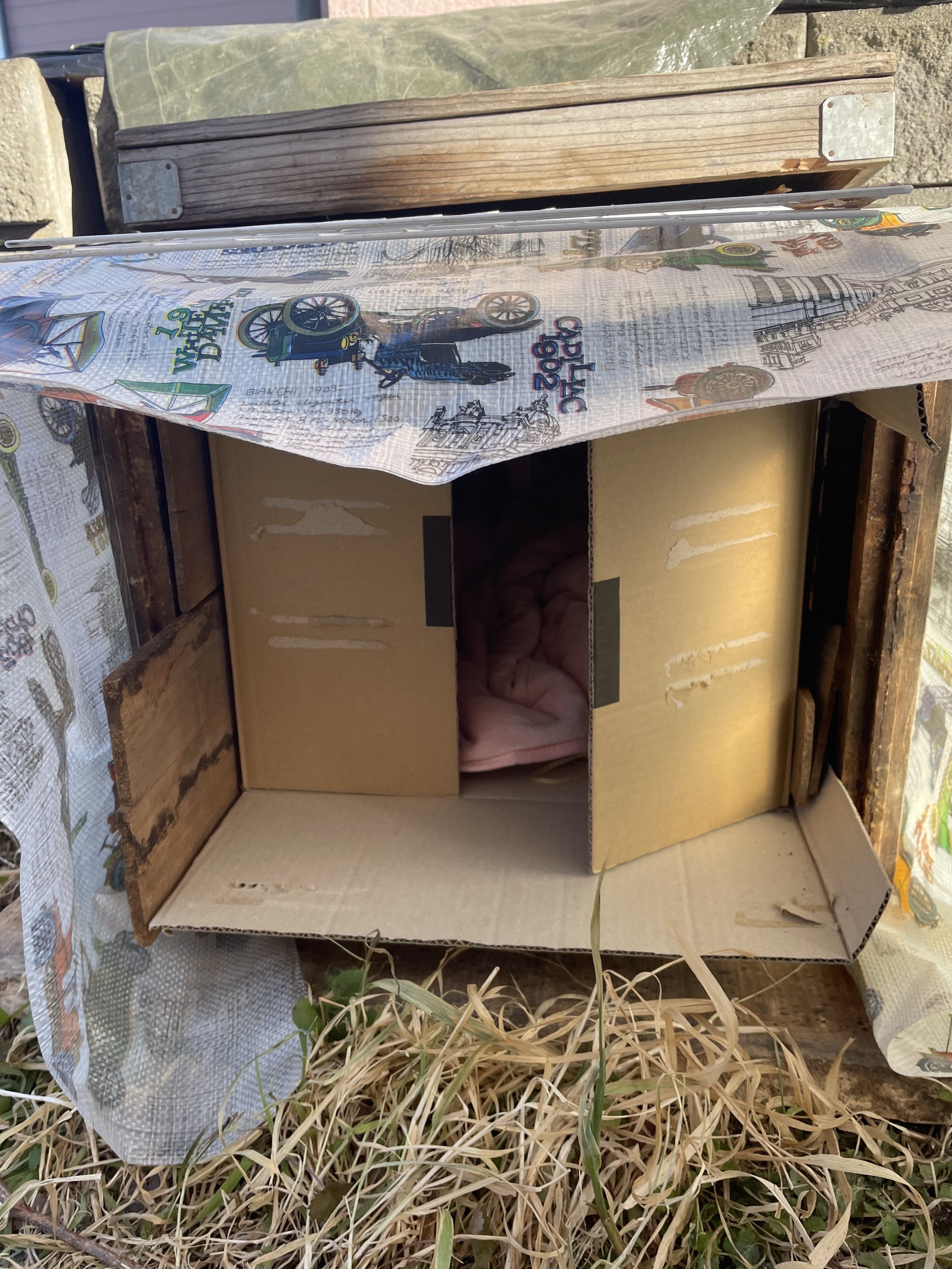 周りにレジャーシートで囲って重しを乗せたり、隙間に桐の板を入れて風が入るのを防ぐ感じで昨日、設置してみました!もう少し工夫が必要かなぁって感じだったのですが、今朝モツくんがこの中に入っているのを見て、大寒を前に少しでも寒さを凌げる場所の提供になれば良いな〜って感じです( ˊᵕˋ )