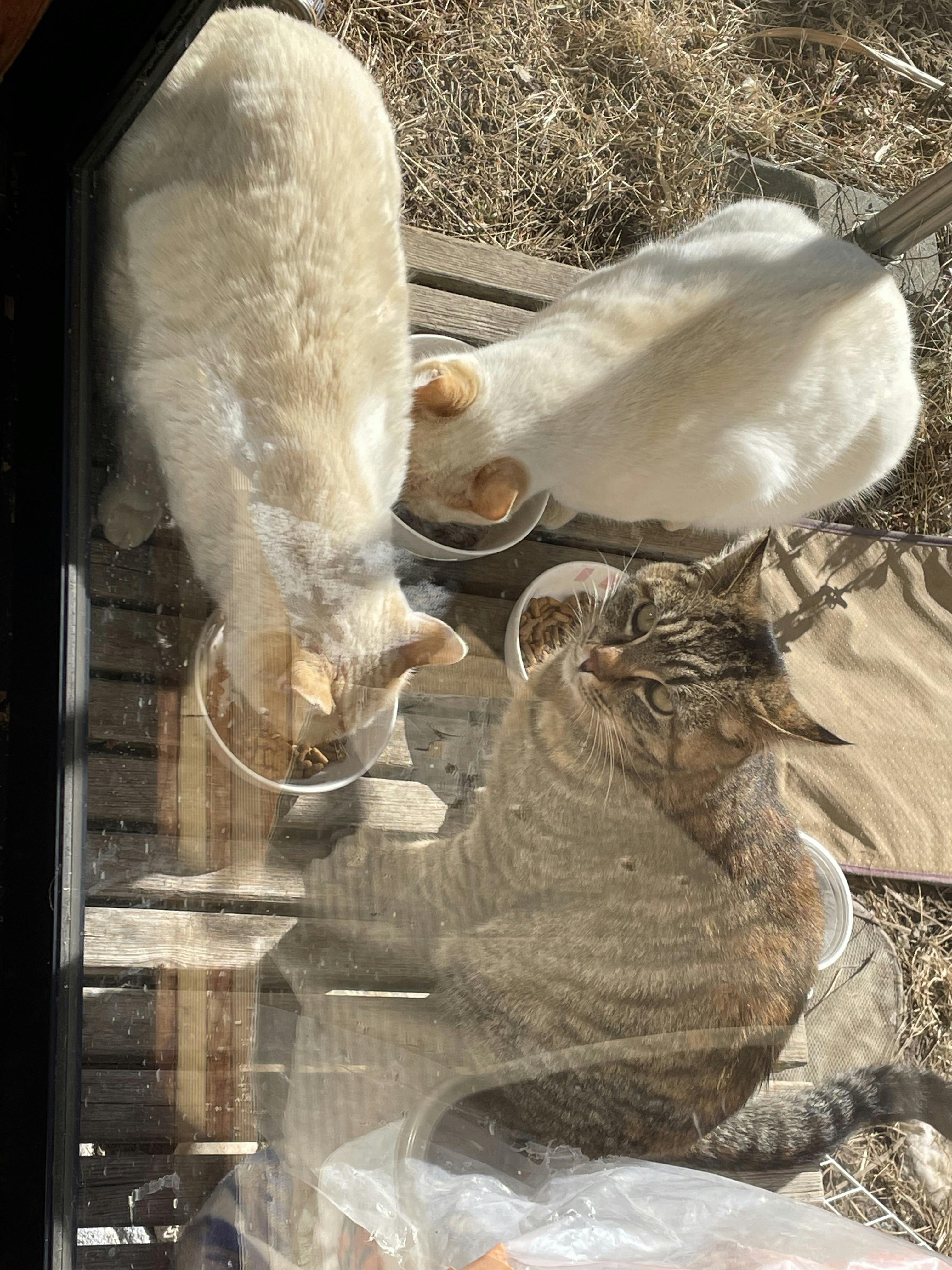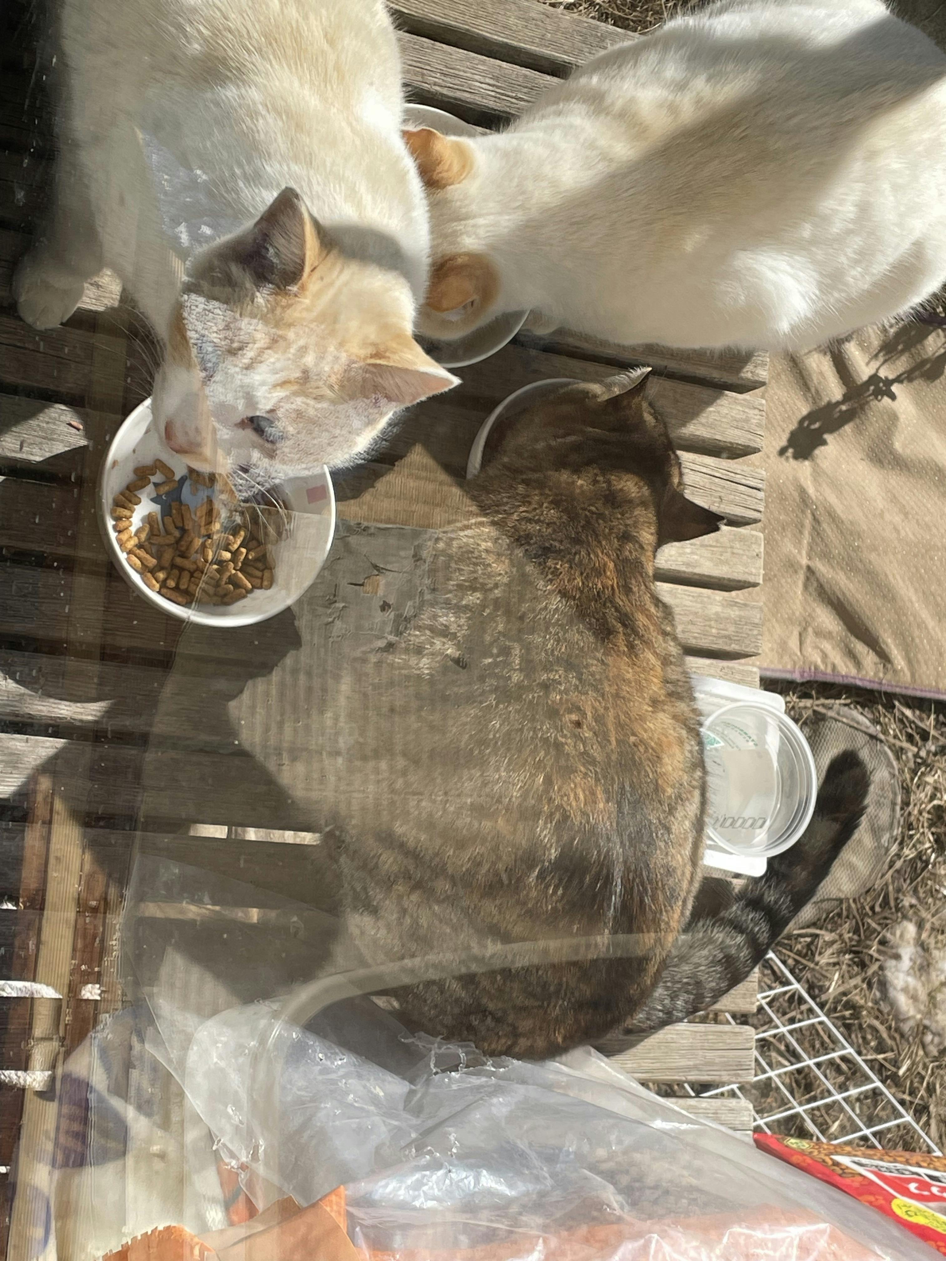 モチくんもモツくんもクリちゃんもビビちゃんもしっかり食べて、体力作りしています(*^^*)チャトくんも毎日来て、ご飯の催促をしてくるのですが、チャトくんは自分のご飯の器にご飯が入ってるのに、何故かビビちゃんやクリちゃん、モツモチ兄弟のご飯を盗みます⋯(._.`)そして、私の足元に纏わりついてくるのに、撫でようとするとシャーっとされます(´˙꒳˙ `)そして噛みつかれます( ̄▽ ̄;)チャトくんは長い間、必死で戦って来たのでしょうね(´-ω-`)中々心を開いてくれません。。。なのでビビちゃんやクリくん、モツくんもモチくんもチャトくんが来るとビビって逃げてしまいます。・*・:≡( ε:)なるべく注意して様子を見てるのですが、難しい感じです(›´-`‹ )…
