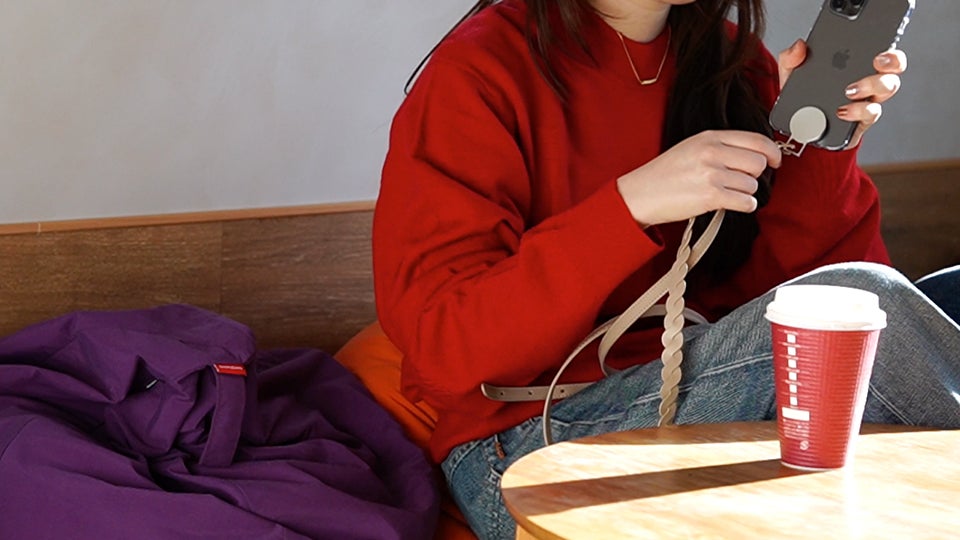 会計時に決済端末が少し遠いと、ショルダーストラップの使い勝手が悪くなるものですが、「MAGHOL」ならスマホをパパッと外せ、スマートに決済ができます。また、片手が塞がっていても、両手を使うことなく取付が可能です。