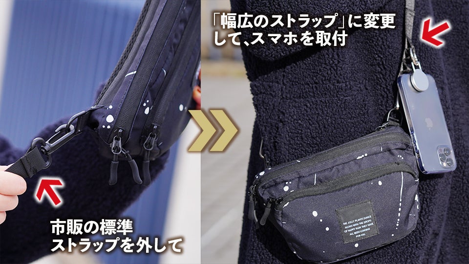 市販のショルダーバックのストラップを取外して、「幅広ストラップ」に交換し、ストラップホールに、スマホを取付するのがおすすめです。