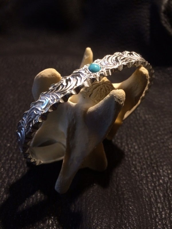 SV950は、純度95%という高純度のシルバーであり、まるで「月のような神聖な白い光」を放ちます。この素材は柔らかく、繊細な造形や唐草模様の打ち込みに適しており、ジュエリーに“個の魂”を表現するのにふさわしい金属です。