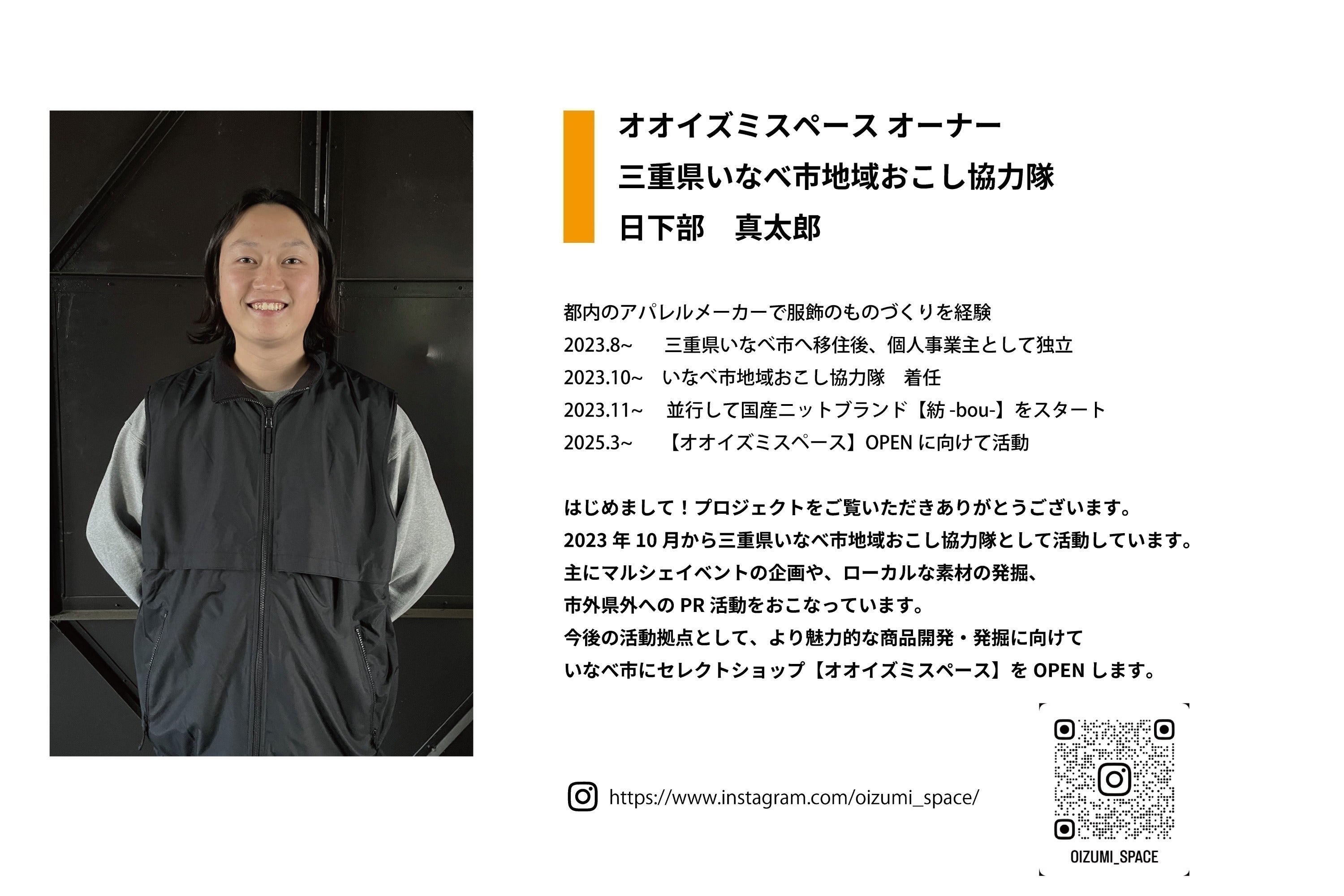 元々東京でアパレルメーカーに勤めていたのですが、独立したいという思いと地元に貢献したいという思いから、いなべ市の地域おこし協力隊として三重県に戻ることになりました。そこで様々なイベントやマルシェ企画をさせていただき、いなべ市のみならず周辺地域の方々と多くの交流をさせていただいております。また地域おこし協力隊だけではなく、個人事業主としてアパレル・グッズ製作のお仕事をさせていただいております。自分たちでもブランドを設立し、マルシェ出店やオンラインでの販売をおこなっています。