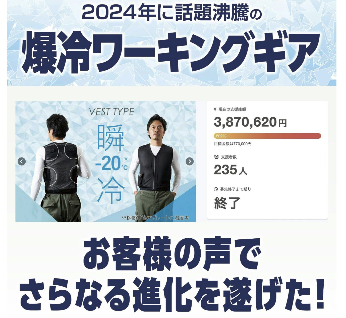 こちらの商品は、昨年のプロジェクトで大きな反響をいただきました「ペルチェベスト」の進化版となります。