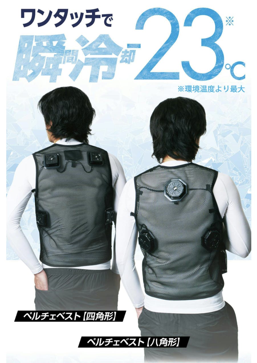 『ペルチェベスト』は、最先端のペルチェ素子技術を搭載し、背中をダイレクトに-23℃冷却。ひとたび着用すれば、まるで自分専用の冷房空間にいるかのような快適さを実感できます。