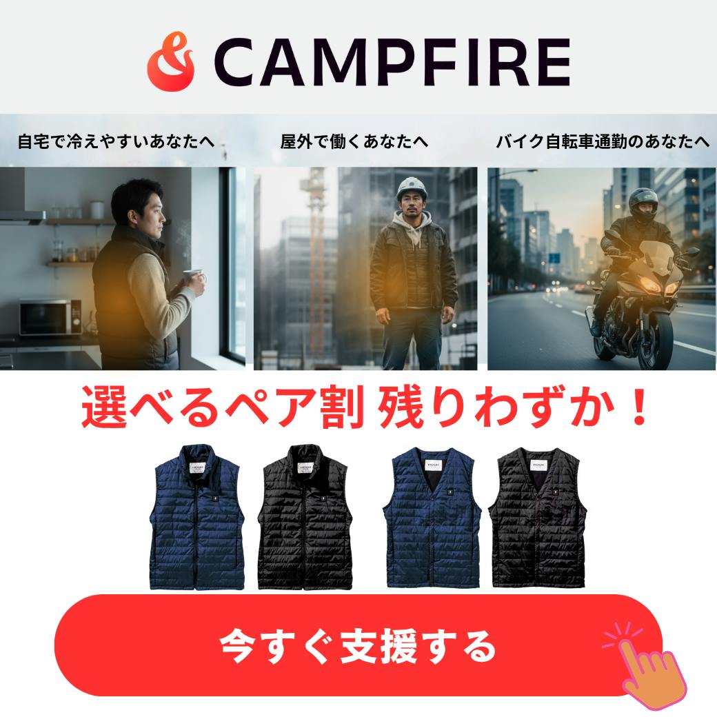 ヒートベストクラウドファンディング、お得なペア割が残りわずかとなりましたのでお知らせです。