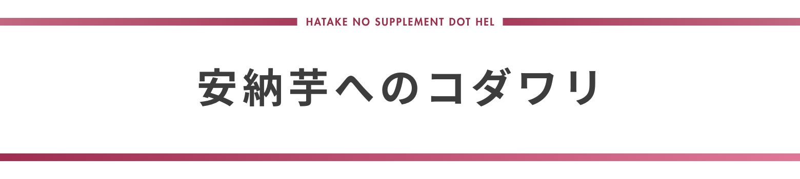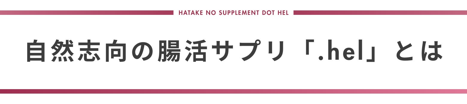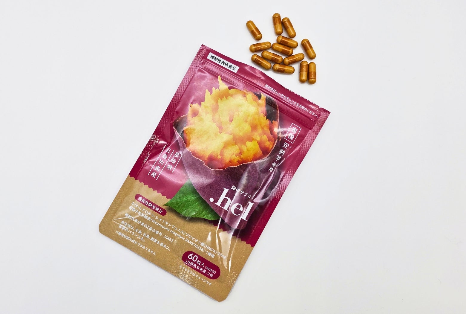 「畑のサプリ.hel(ドットヘル)」は、有機JAS認証の安納芋から加工された有機安納芋パウダー、米ぬかから生成された(3-(4-ヒドロキシ-3-メトキシフェニル)プロピオン酸(HMPA)、緑麦芽から抽出された有胞子性乳酸菌を使用した「自然志向の腸活サプリ」です。