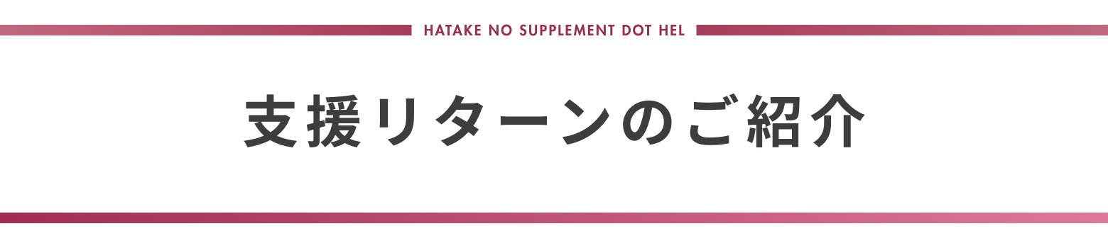 今回のプロジェクトにおける支援リターンは、2つの考え方に基づいて設定しました。1つ目は、私たちが開発した「畑のサプリ.hel(ドットヘル)」を一人でも多くの方に届けたいという想い。2つ目は、私たちが事業を行っている長崎・五島列島の名産品に触れる機会をすこしでも増やし、地元の一次産業をともに盛り上げたいという想いです。