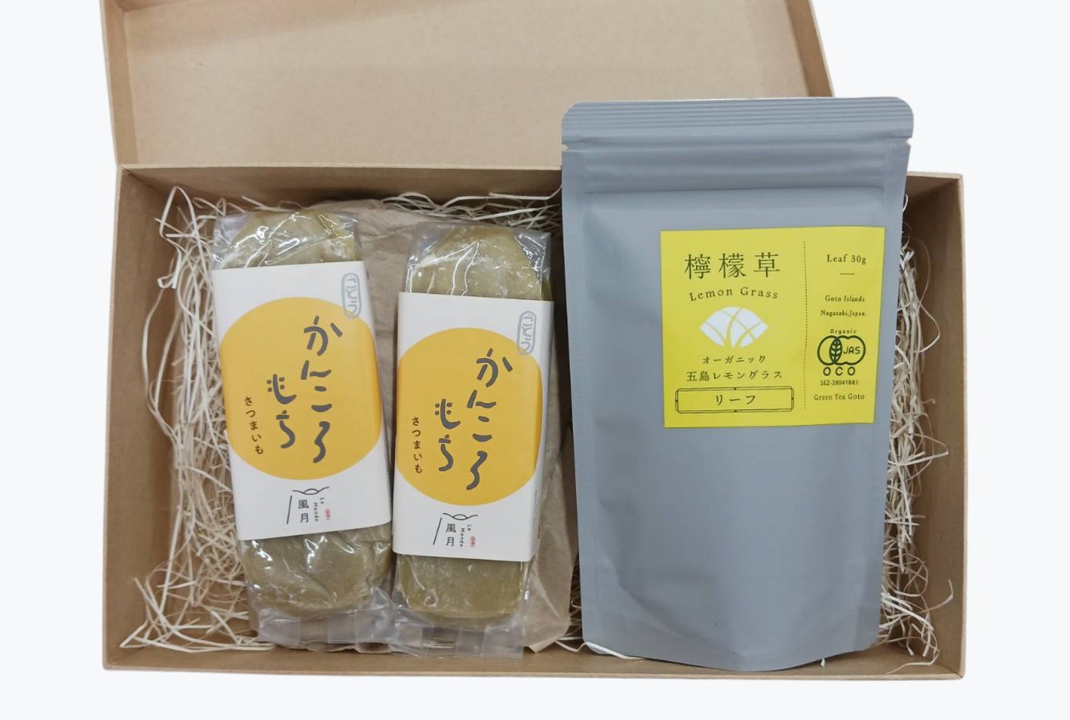 かんころ餅 2本、オーガニック五島レモングラス30g入り 1袋が入ったセットです。自然と共にある暮らしの豊かさを感じながら、ご自宅でほっとひと息つく贅沢なティータイムをお楽しみください。