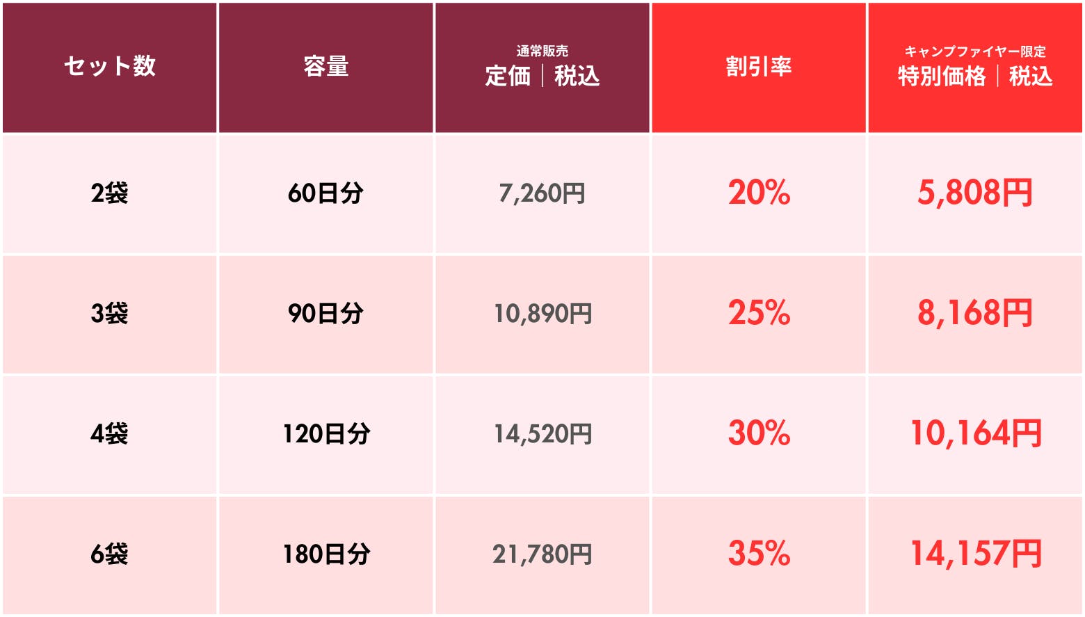 2袋セット、3袋セット、4袋セット、6袋セットと4プランをご用意しました。セット数が増えるほど割引率が高くなるキャンプファイヤー限定のオトクな支援リターンです。