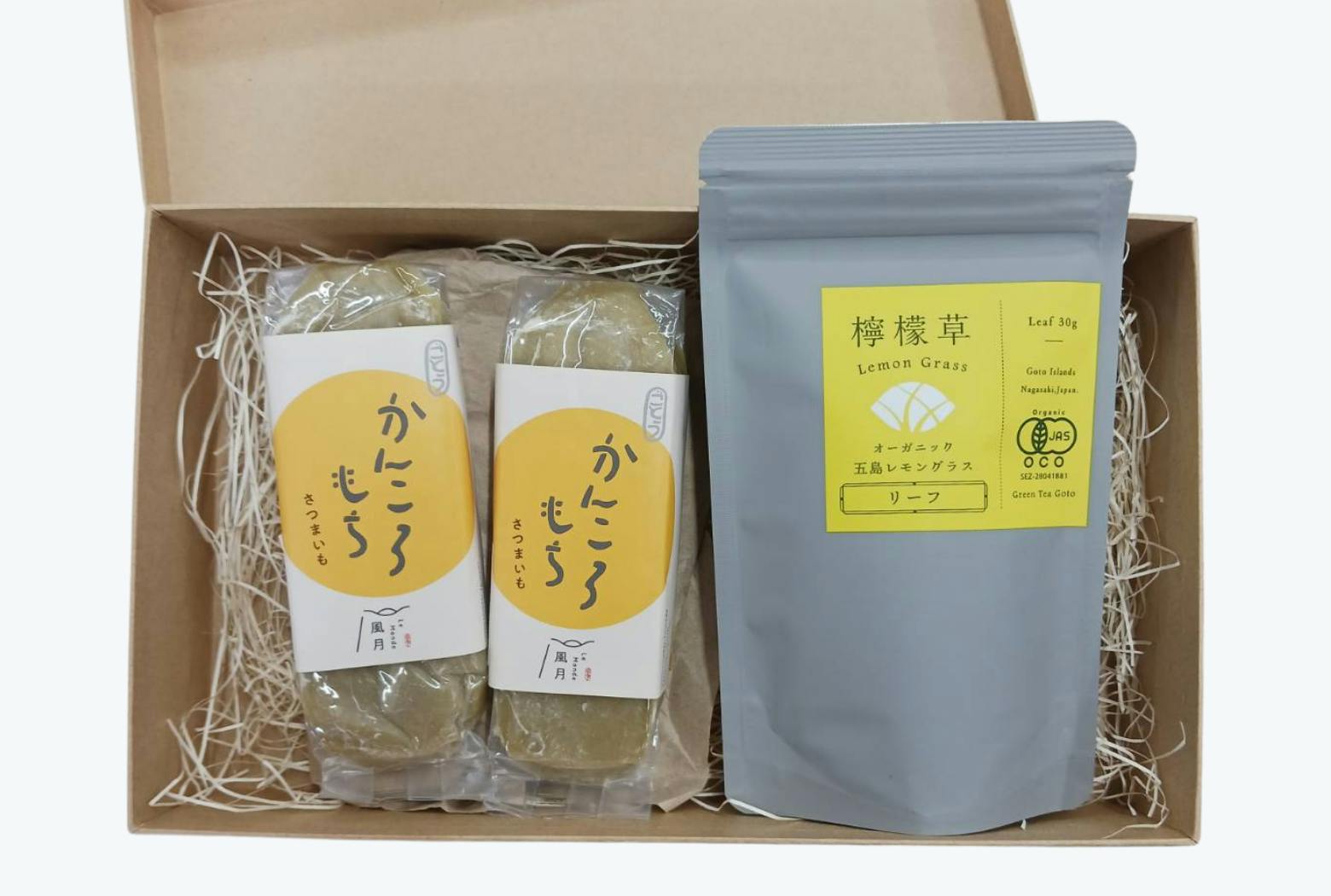 かんころ餅 2本、オーガニック五島レモングラス30g入り 1袋が入ったセットです。自然と共にある暮らしの豊かさを感じながら、ご自宅でほっとひと息つく贅沢なティータイムをお楽しみください。