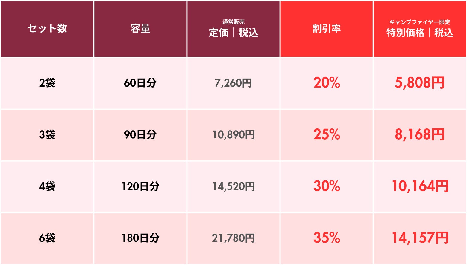2袋セット、3袋セット、4袋セット、6袋セットと4プランをご用意しました。セット数が増えるほど割引率が高くなるキャンプファイヤー限定のオトクな支援リターンです。