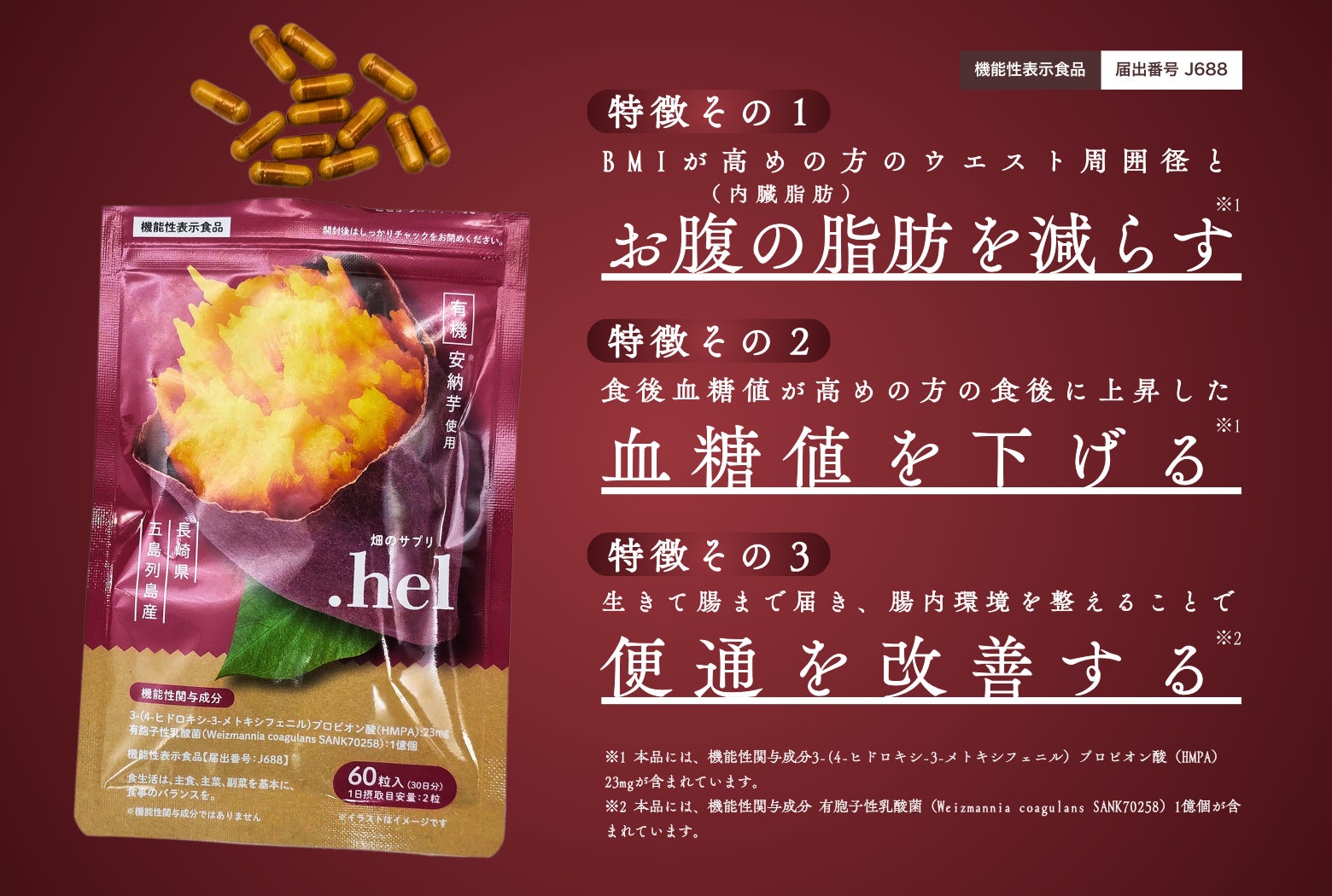 「畑のサプリ.hel(ドットヘル)」は、有機JAS認証の安納芋から加工された有機安納芋パウダー、米ぬかから生成された(3-(4-ヒドロキシ-3-メトキシフェニル)プロピオン酸(HMPA)、緑麦芽から抽出された有胞子性乳酸菌を使用した「自然志向の腸活サプリ」です。