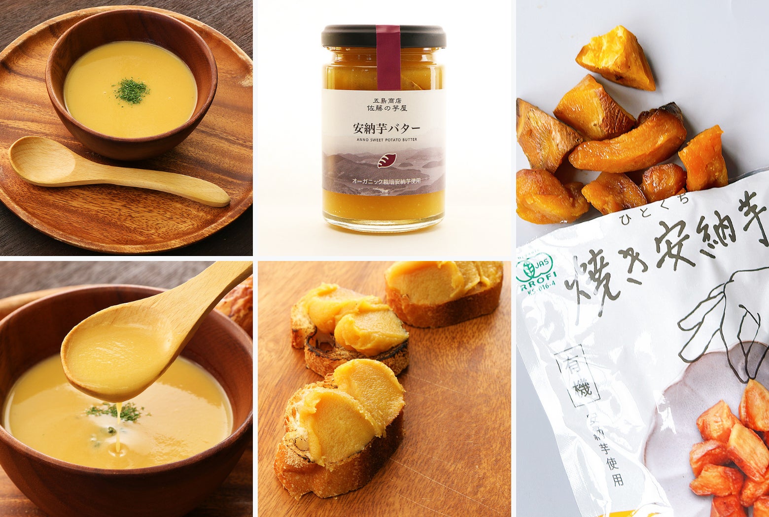 安納芋ポタージュ 2袋:まるで安納芋をそのまま味わっているかのような濃厚スープ。自然な甘さと香りがぎゅっと詰まった人気商品。夏は冷製スープ、冬はホットで楽しめます。