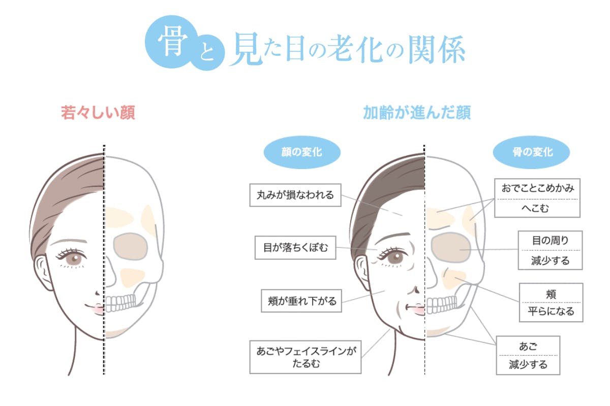 また、女性ホルモンは骨を作る細胞(骨芽細胞)の活動を促し、骨を壊す細胞(破骨細胞)の活動を抑制します。女性ホルモンの減少で骨の生成が減り、骨形成の材料となるコラーゲンの低下で、骨が衰えることにより見た目年齢を大きく老化させてしまうのです。