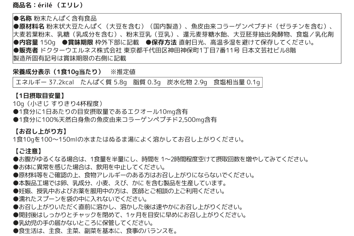 A .érilé(エリレ)に配合されているエクオールは大豆胚芽を発酵させて作っています。大豆アレルギーの方は摂取をお控えください。また、ナチュラルマリンコラーゲンには乳糖が配合されています。乳製品アレルギーの方も摂取をお控えください。
