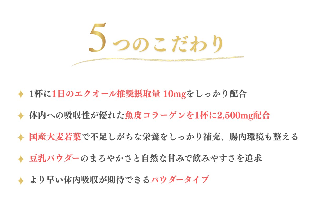 また、肌のツヤ・ハリ、髪の毛のツヤ・ハリ、骨や血管の強化、自律神経のバランスを整える効果が期待でき、見た目も体の中も、いつまでも若々しく健康でありたいと願う女性の救世主なのです。