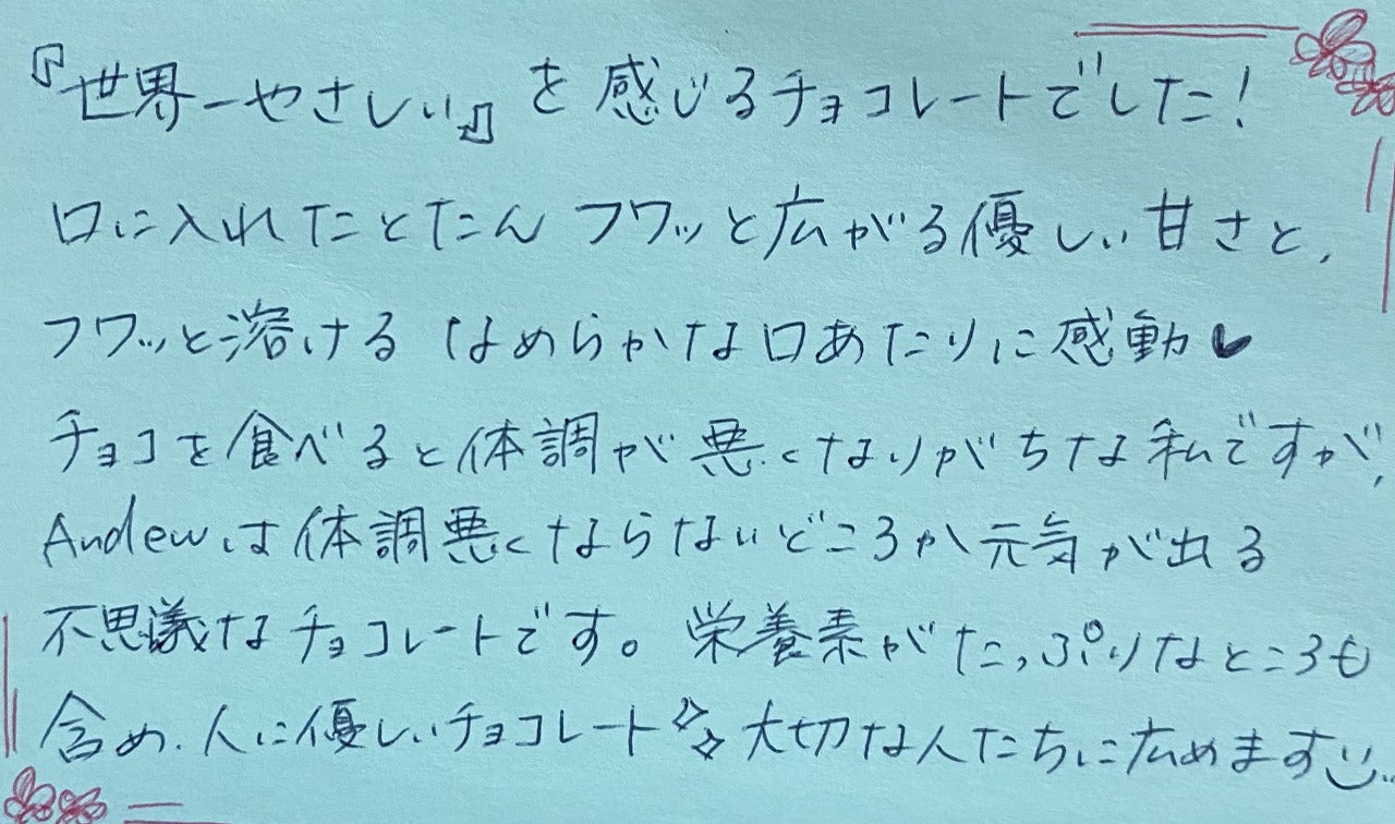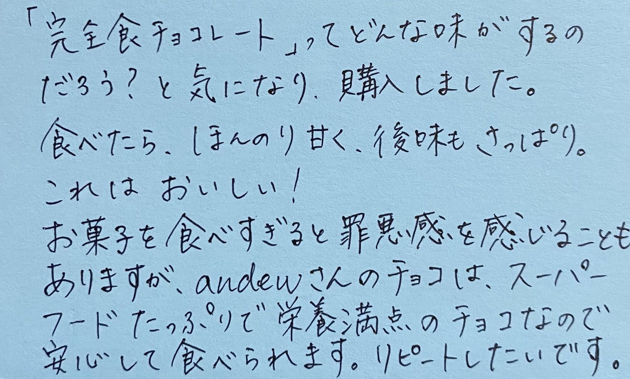 andewのチョコレートを実際に食べて頂いた方の声を一部ご紹介します。