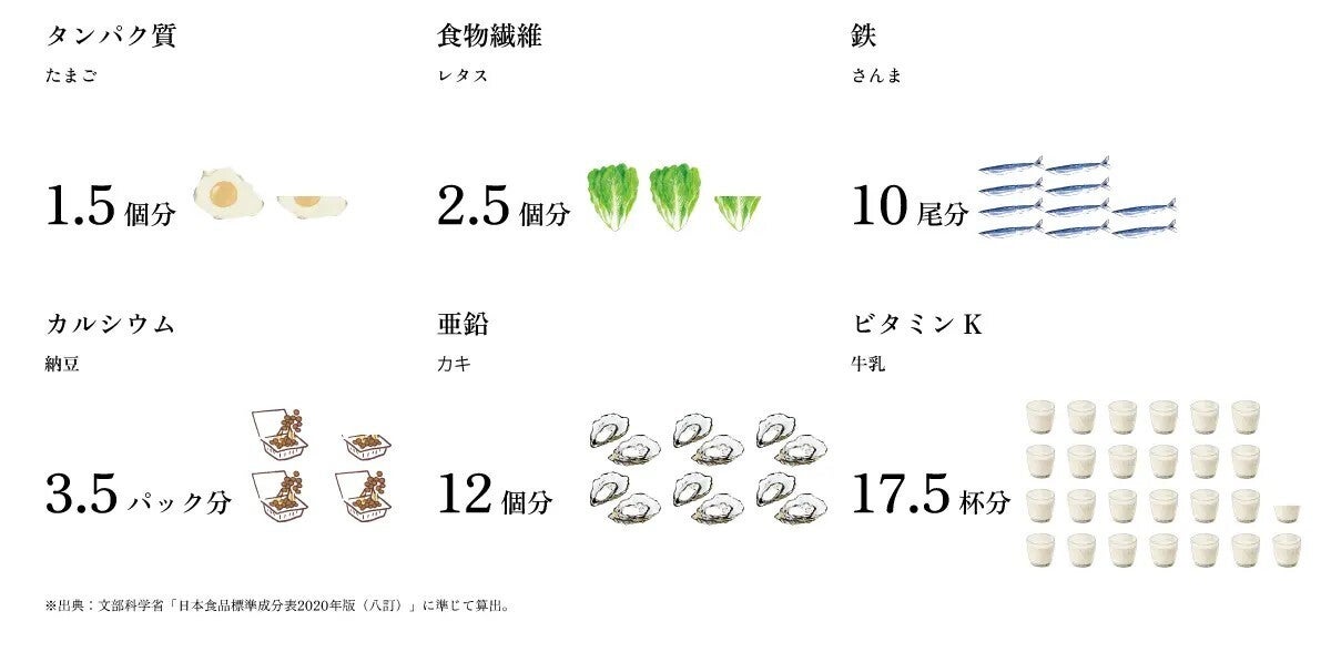 日本食品標準成分表(厚生労働省より)で定める、日本人に必要な栄養素がすべて含まれており、食事では摂りきれない栄養素を補うというかたちになっています。