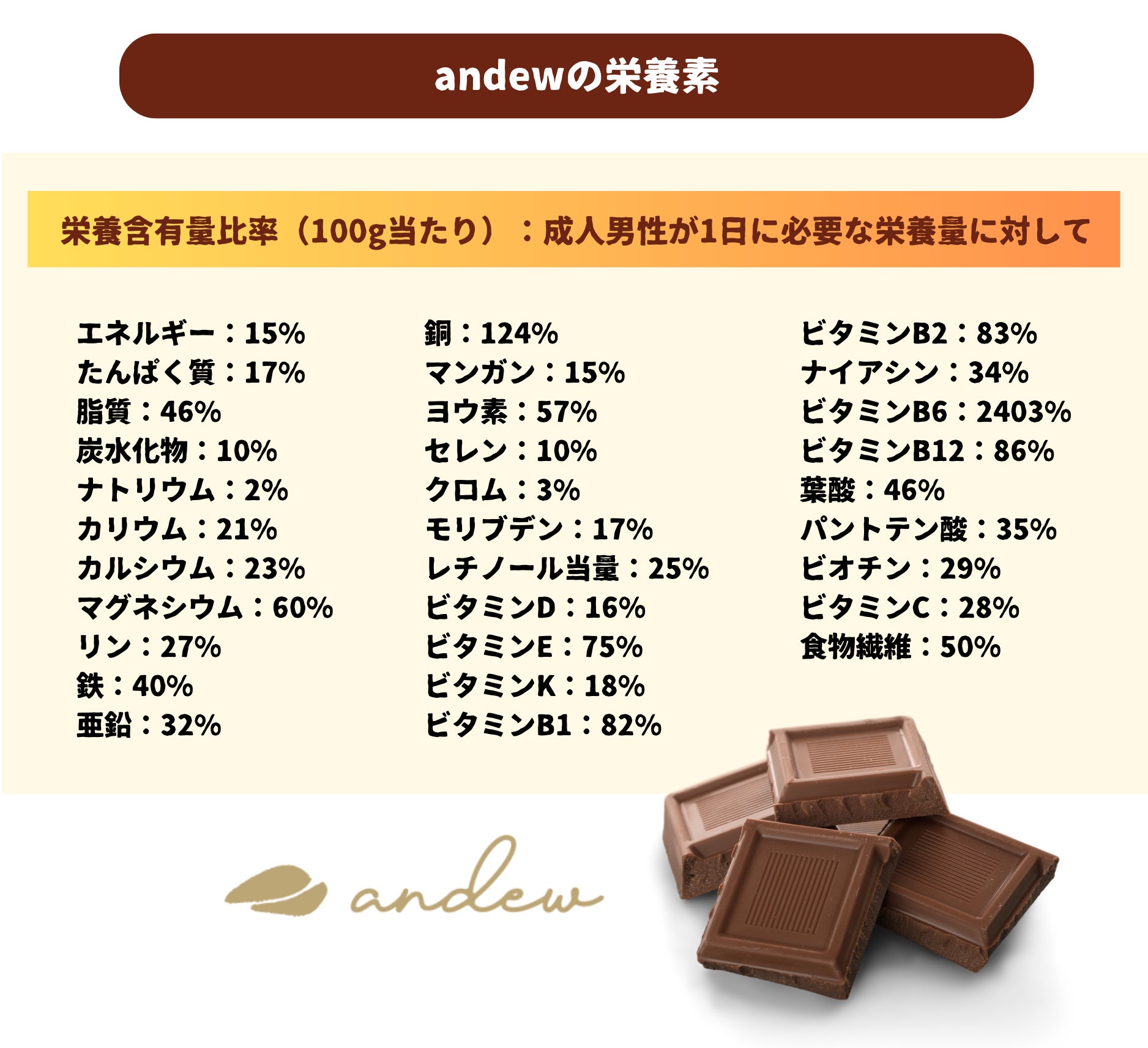 完全栄養チョコレート「andew」は、カカオマスとカカオバターをベースに、「アーモンド、チアシード、きな粉」などの素材を独自の配合で加えています。