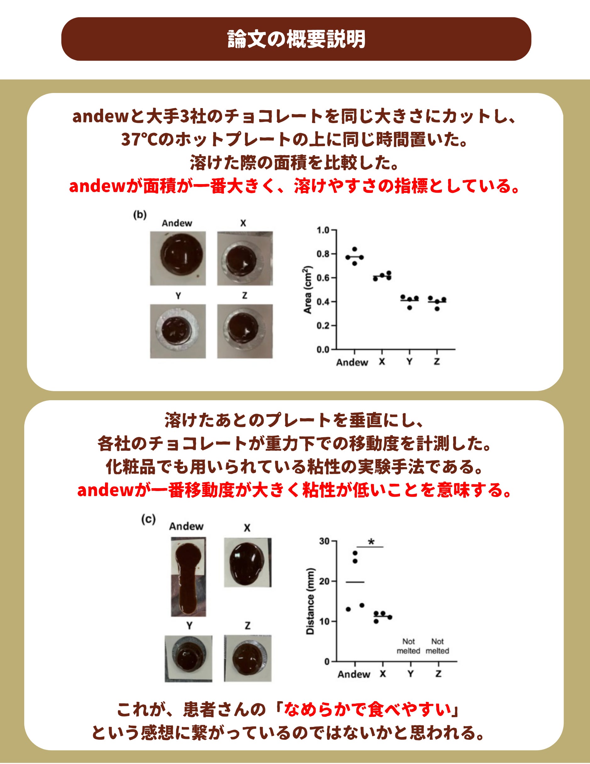 世界一やさしいチョコレートandewでは、ショコラティエの技術をもとに、通常のチョコレートよりも2〜3℃ほど融点が低く、溶けやすいチョコレートを実現しました。