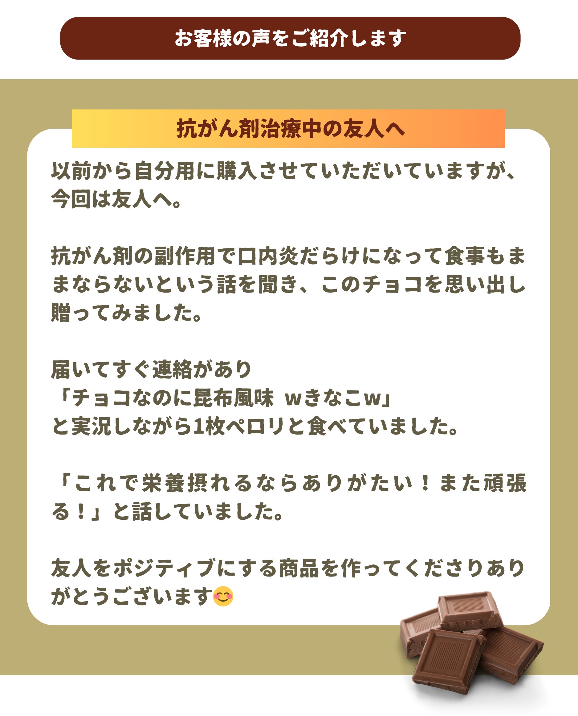 “食べることが痛い”という現実と闘う方々の声から生まれたチョコレートは、今ではがん患者さんや偏食に悩む子どもたちにも届くようになりました。