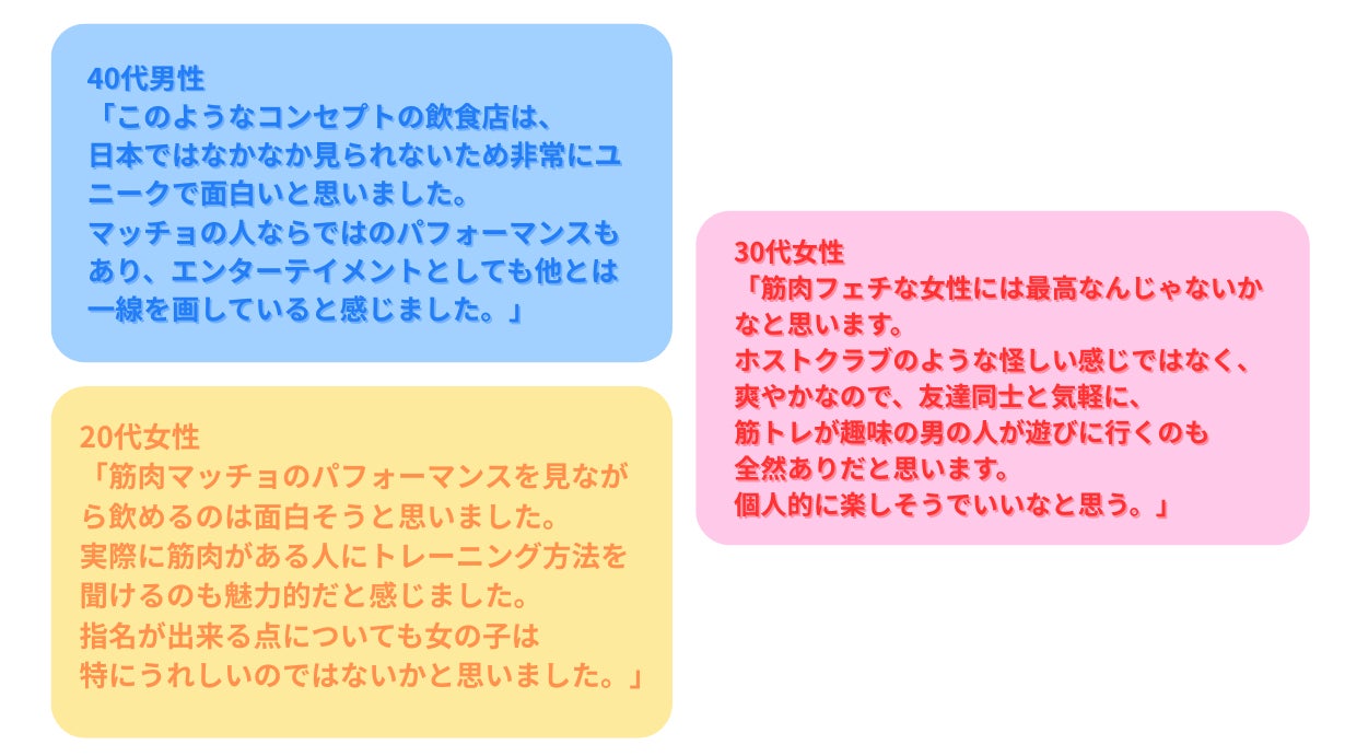 実際に、「マッチョバーに関心があるか」を調査したインターネットアンケートの結果、男女とも実に79%の人たちが「行ってみたい!」という高評価。