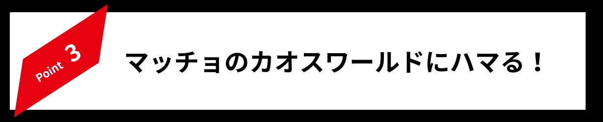 筋肉を愛する者たちは、日頃の会話や行動も筋肉やトレーニングに結び付ける癖があり、キャストたちのコミュニケーションでは、マッチョのカオスで明るい体育会系のノリにどっぷりハマれます。