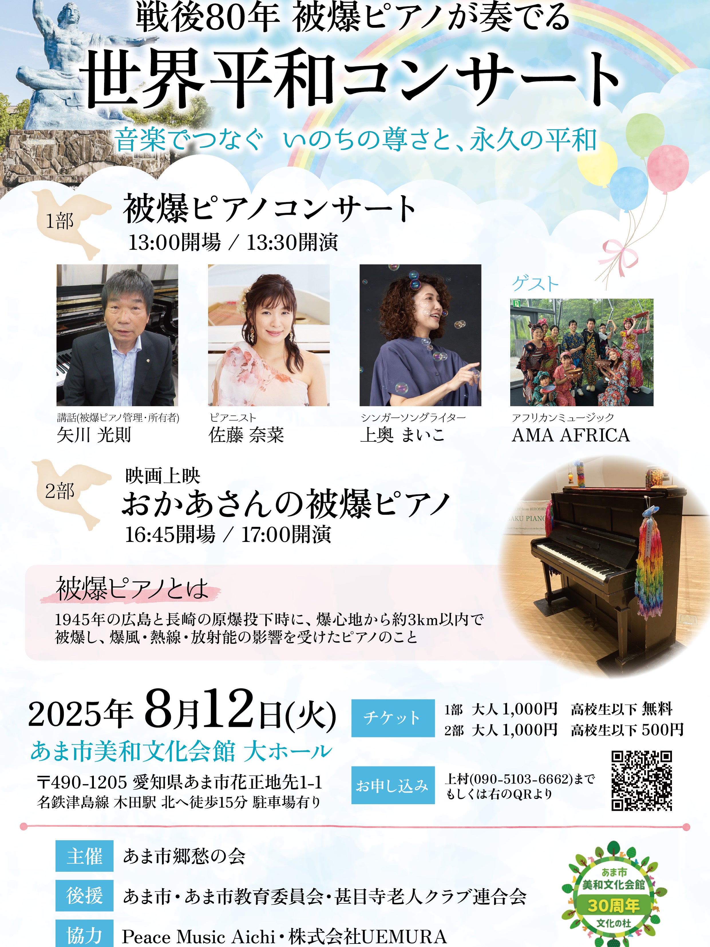2025/07/04 07:50Peace MusicAichiは、8/12あま市に行われる被爆ピアノ世界平和コンサートを応援、想いを繋ぎます! 被爆ピアノをきっかけに、Peace Music Aichiが立ち上がりました!そして、Peace Music Aichiのメンバーでもある、上村さん『あま市郷愁の会』主催のコンサート。7/27の平和コンサートから、8/12の被爆ピアノ世界平和コンサートへ、私たちの想いを繋げます!!クラウドファンディングの中身でも、企業協賛、個人協賛の方のお名前を、7/27平和コンサートと、8/12あま市被爆ピアノ世界平和コンサートと、両方に協力で載せさせていただきます!応援、していただいた企業様、個人の方に心よりお礼申し上げます。クラウドファンディングは、あと数日となりました!引き続き、平和の想いを一緒に広げていくために、お力を貸していただけると嬉しいです!よろしくお願いいたします!⭐︎8/12(火)被爆ピアノ世界平和コンサート⭐︎inあま市美和文化会館大ホール⭐︎戦争の悲しみを伝え、次世代に平和の大切さを考えるコンサート。今回は、長崎から、心に響く歌声のシンガー上奥まいこさん、そして、体から音楽を伝えるアフリカンミュージック、ゲストはAMA.AFRICAさん。悲しみを生き抜いて、生きる強さを伝える被爆ピアノの音色と共に、世界平和について考えるコンサートです。みんなが手を取り合って、繋がる世界へと被爆ピアノの想いをのせて演奏し、演奏の皆さんと、開場にいる皆さんと奏でます!音楽を通して、命の大切さを、被爆ピアノと共に、あま市で世界平和を歌っていきたいと思っています!第一部13:00 開場 13:30 開演 コンサート上奥まいこ、佐藤奈菜、 AMA.AFRICA.(guest)、子供の演奏 大人1,000円 高校生以下 無料第二部16:45開場 17:00 映画上映 『おかあさんの被爆ピアノ』大人1,000円 高校生以下500円主催 あま市郷愁の会後援 あま市・あま市教育委員会・甚目寺老人クラブ連合会協力 Peace Music Aichi、 株式会社UEMURAご予約フォームhttps://docs.google.com/forms/d/e/1FAIpQLSflYZCAYafCF6x84BIfSPtpmK5F0HzQvQjI14jYqjZhraMdYg/viewfor もっと見る