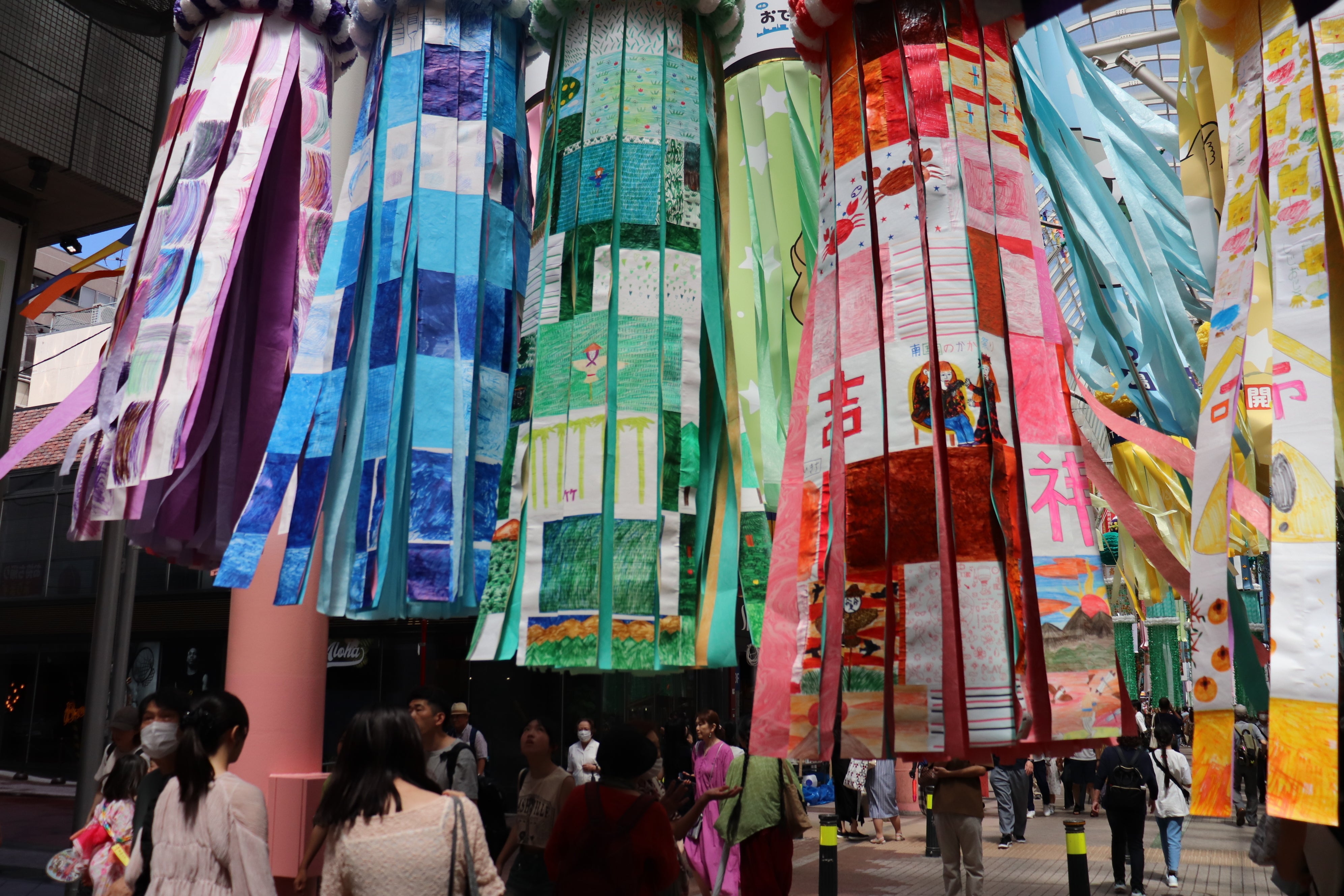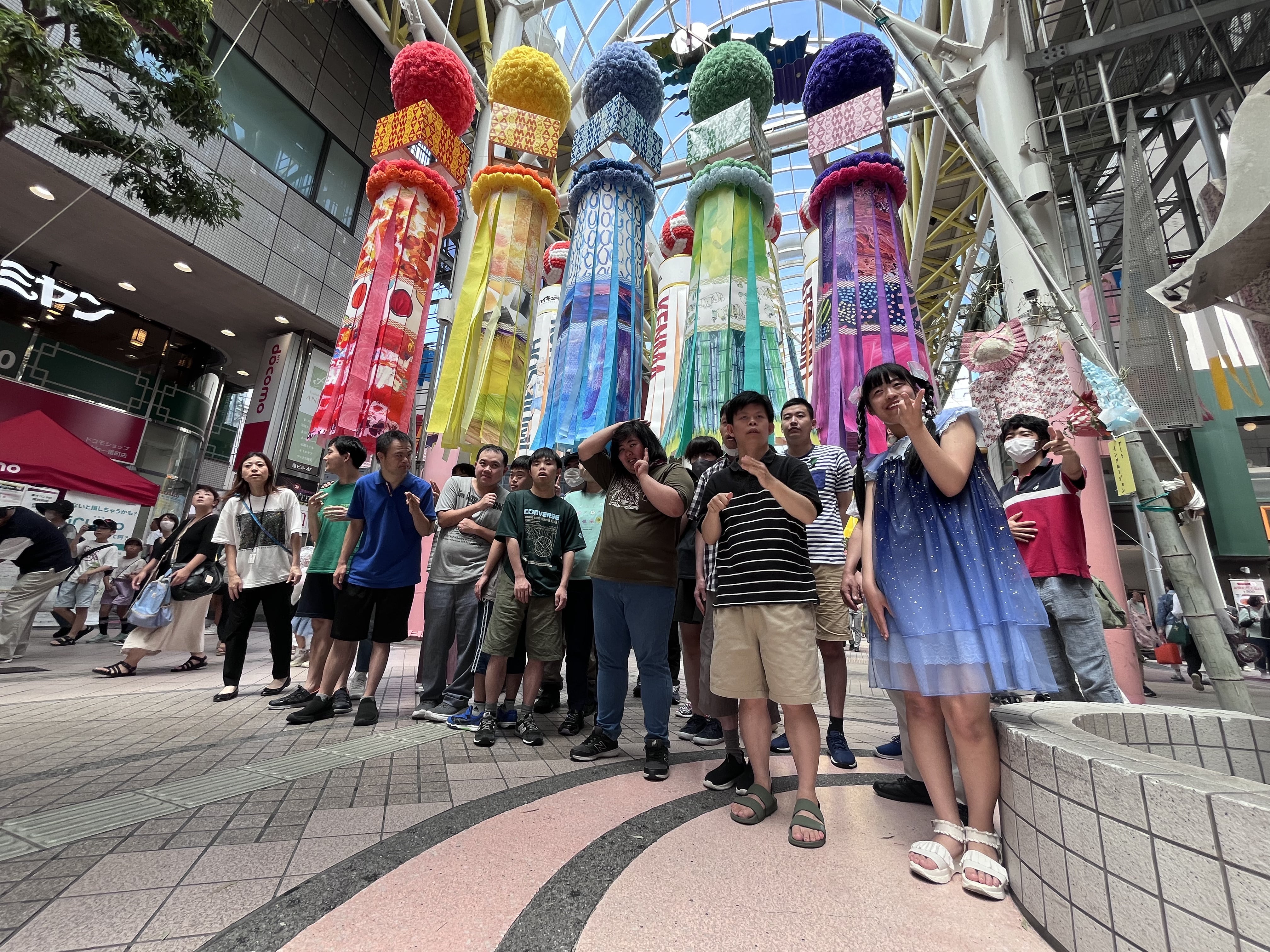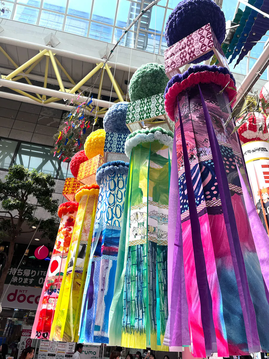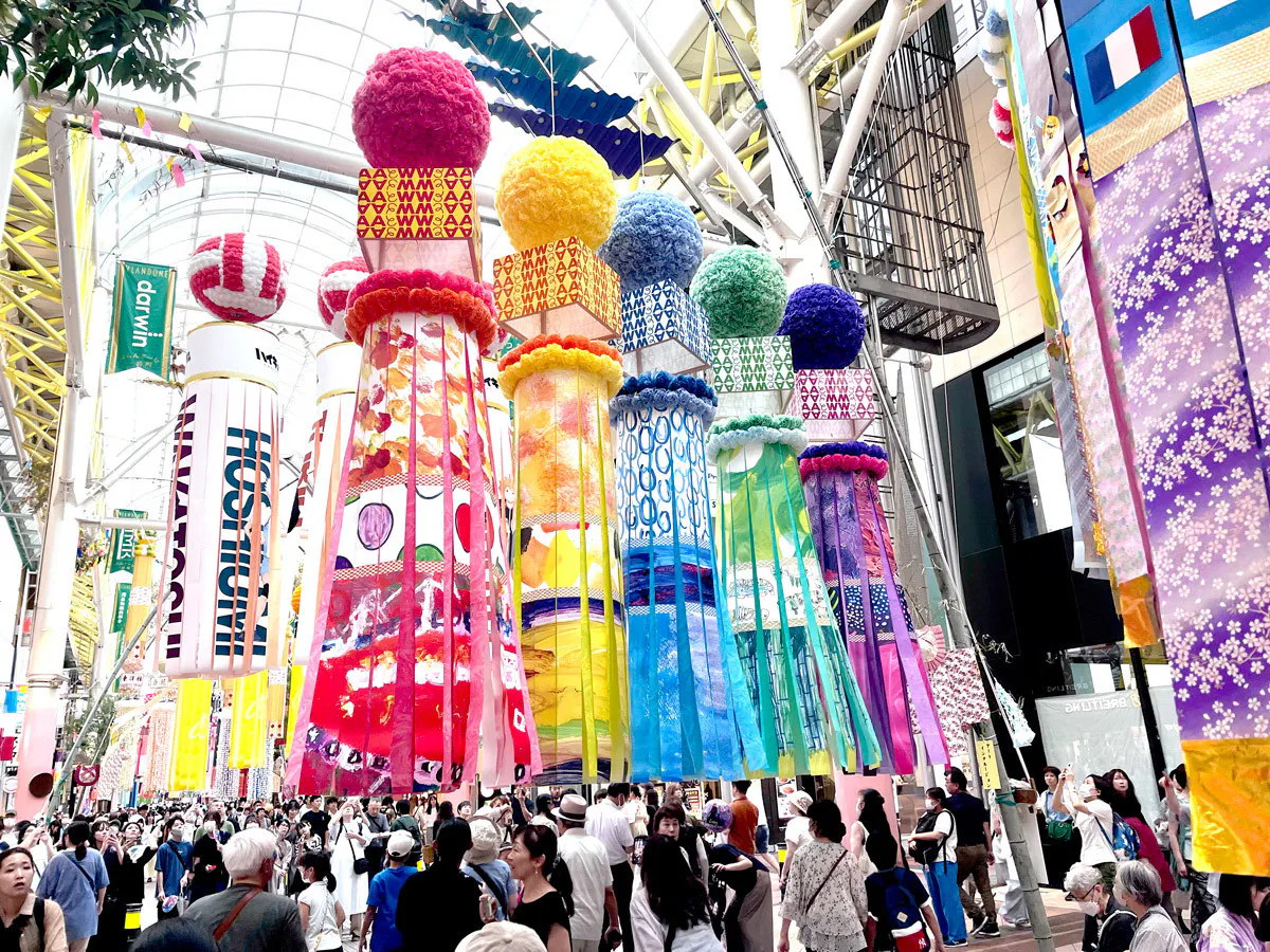 大きな七夕飾りがたくさん飾られるぶらんど〜む一番町アーケードに私たちアート・インクルージョンは居を構えています。