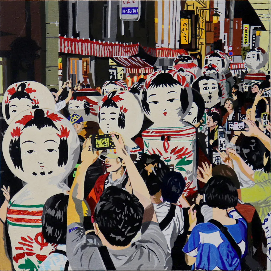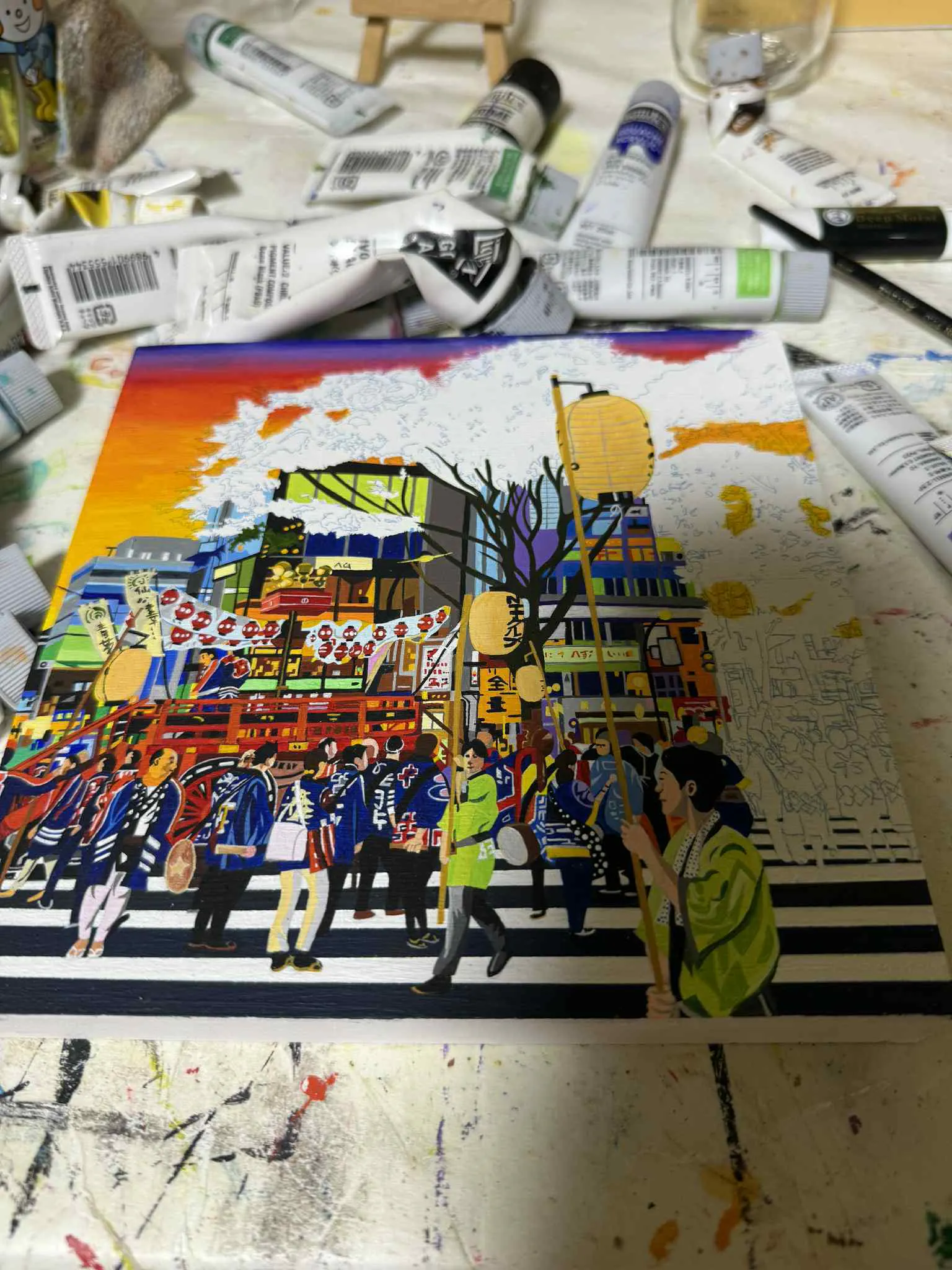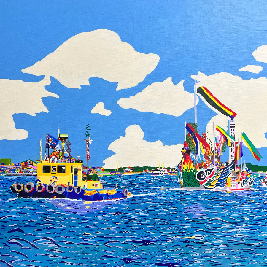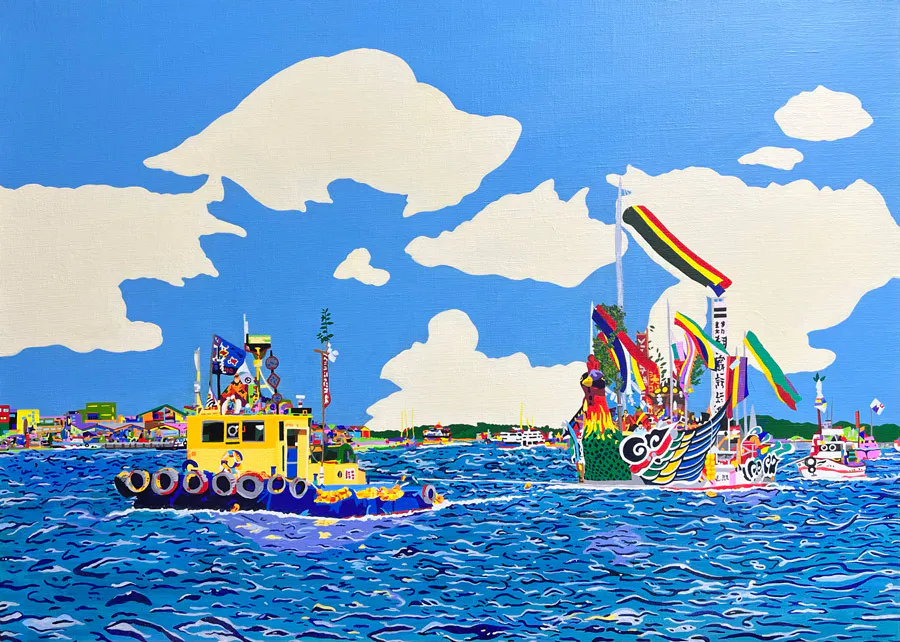 昨年アート・インクルージョン・ファクトリーに所属するアーティスト妄想エンジン全開娘(成田真梨菜)が塩竈港まつりの風景を描いた作品を製作し、クルーズ客船「飛鳥Ⅲ」アート公募展に出品し、準グランプリを受賞しました。それまで真梨菜さんは風景画を描いたことはほぼなかったそうですが、真梨菜さんの作風であるカラフルさや緻密さが風景の中に絶妙に落としこまれていて、素晴らしい作品になりました。