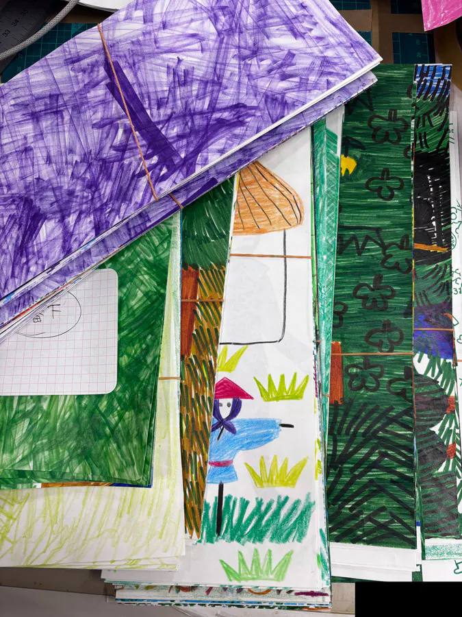 そこで、今年の七夕飾りの吹き流しにはたくさんのドローイングをパッチワークのように貼り合わせて使用してみることにしました。